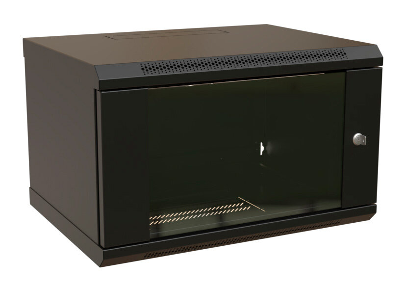 Шкаф WRLINE коммутационный (WR-TW-0645-GP-RAL9004) настенный 6U 600x450мм пер.дв.стекл 2 бок.пан. направл.под винты 60кг черный 350мм 367мм IP20