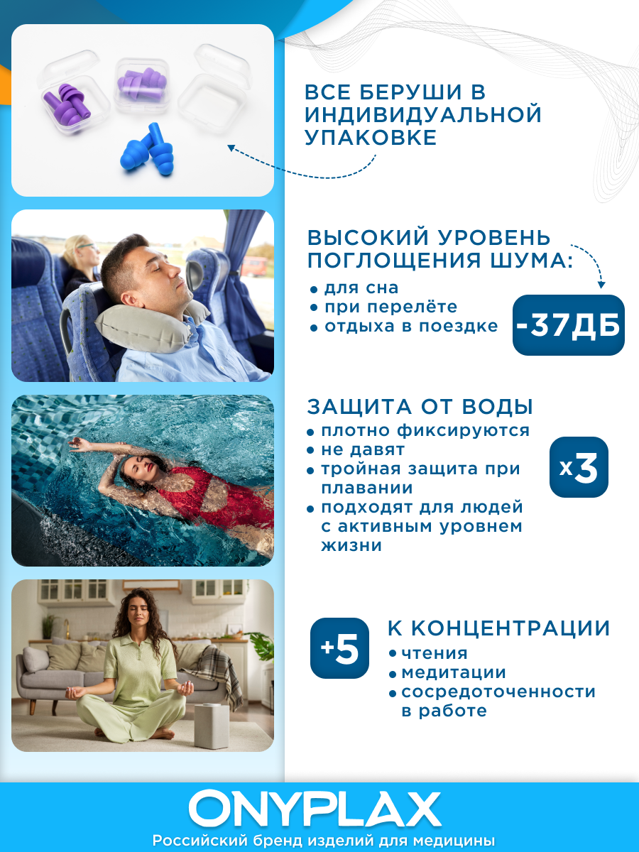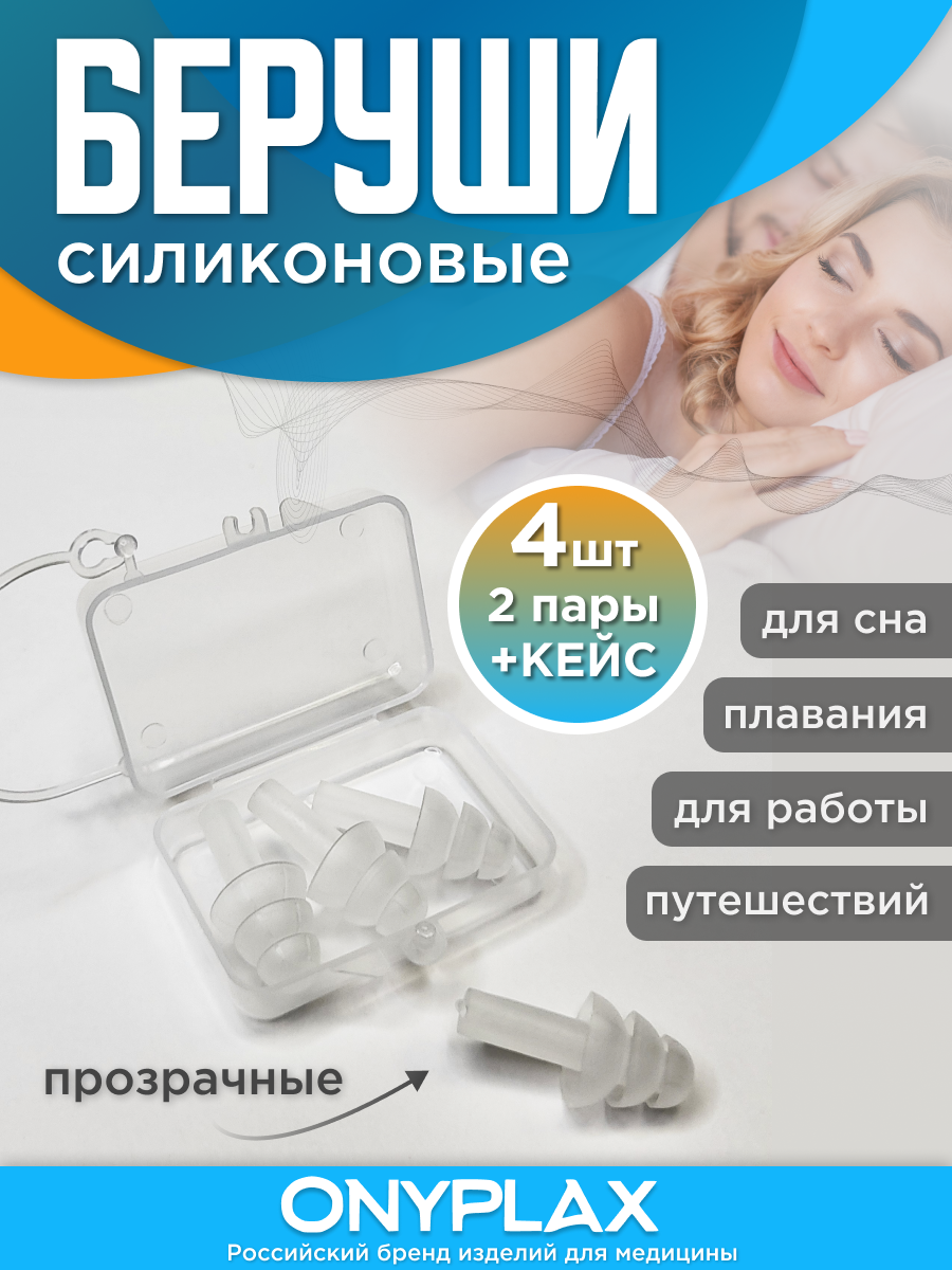 Беруши для сна Onyplax, многоразовые, для плавания, силиконовые, 4 шт, кейс в подарок, противошумные, цвет прозрачный. интересное: