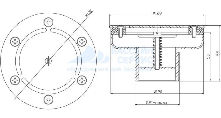 Форсунка донная регулируемая д. 120 (плитка) G2" (наружн.) нержавеющая сталь AISI-304 /ФП.122.3/, цена - за 1 шт интересное: