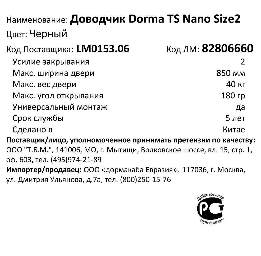 Доводчик дверной Dorma TS Nano Size 2 максимальная нагрузка 40 кг алюминий цвет черный интересное: