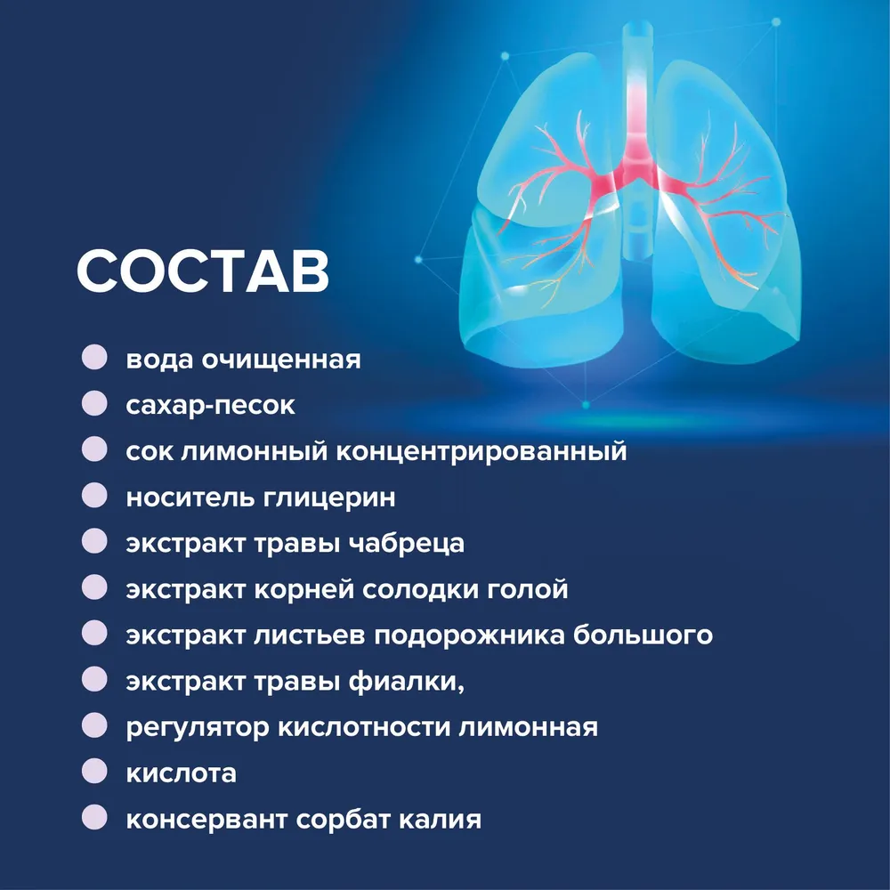 | Фармакологическое действие | Оказывает отхаркивающее, противовоспалительное, противомикробное и бронхолитическое действие, снижает вязкость мокроты и ускоряет её эвакуацию. Обладает общеукрепляющим и тонизирующим действием. Является источником флавоноидов и глицирризиновой кислоты.Трава чабреца оказывает отхаркивающее действие, используется как общеукрепляющее и тонизирующее средство.Корень солодки повышает секреторную функцию эпителия органов дыхания, под его воздействием происходит разжижение мокроты, облегчается дыхание в период простудных заболеваний. Оказывает отхаркивающее действие, регулирует водно-солевой обмен. Глицирризиновая кислота, являющаяся активным действующим веществом солодки, проявляет противовирусное действие.Листья подорожника оказывают противовоспалительное и отхаркивающее действие.Трава фиалки оказывает отхаркивающие действие.Сок лимона является источником витамина С, повышает иммунитет. |