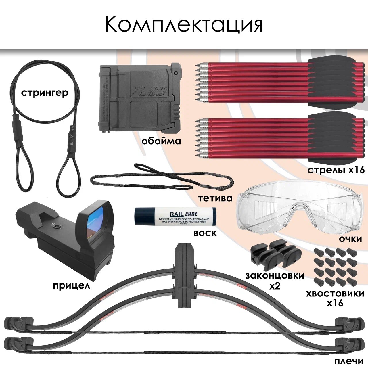| Подробная комплектация | 16 алюминиевых болтов #1616 длиной 6.5" дюймов, плечи 40,5 кг (90 lbs), плечи 27 кг (60 lbs), качественный алюминиевый коллиматорный прицел с одной точкой, магазин для быстрой зарядки, стингер, запасная тетива, воск для тетивы, защитные очки. |