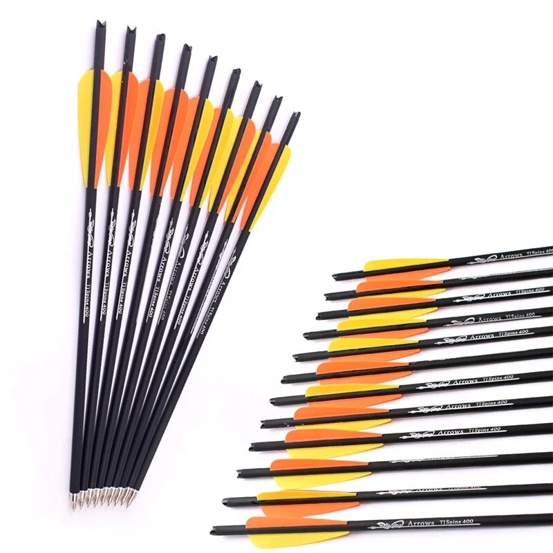 Купить Углеродная стрела для охоты из арбалета, стрельбы из лука, оранжевое и желтое перо, колюще 400, 16 дюймов, 17 дюймов, 18 дюймов, 20 дюймов, 22 дюйма