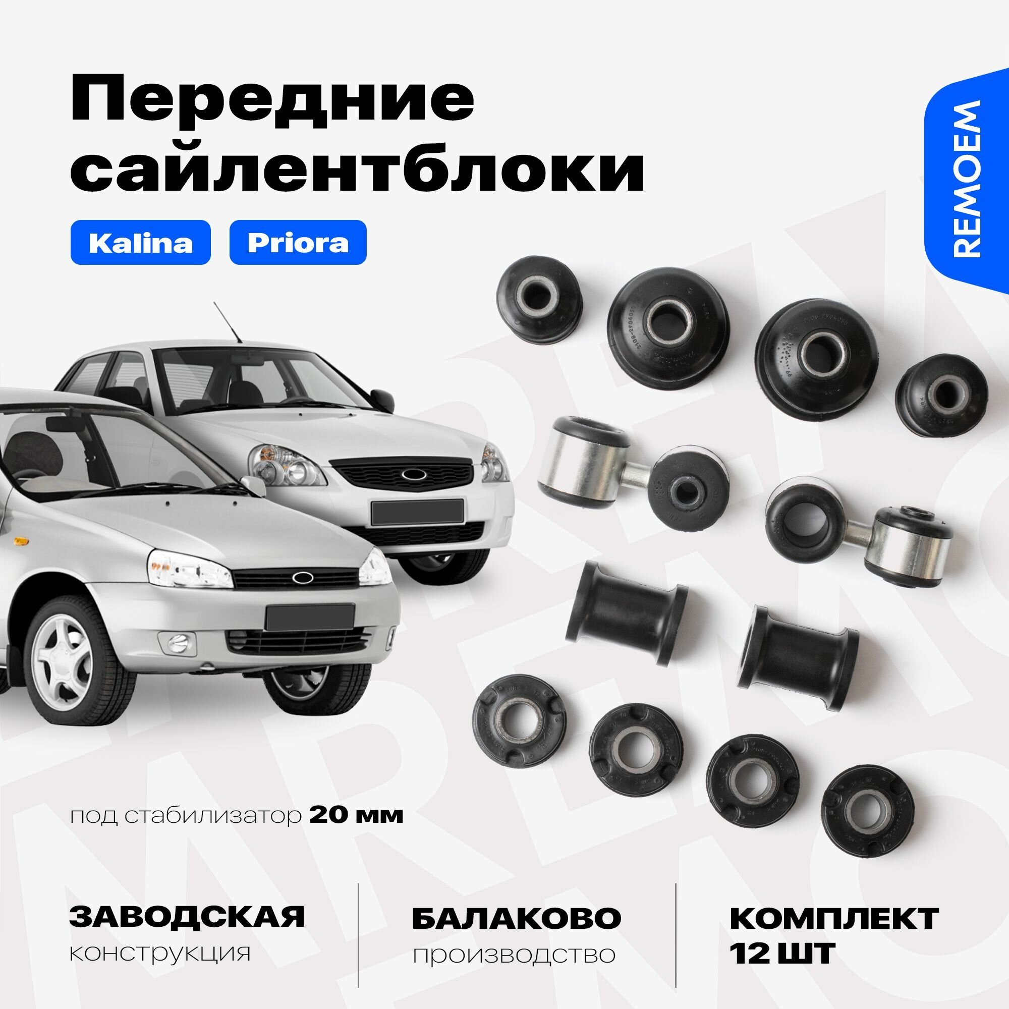 Купить Сайлентблоки Приора 2170, Калина 1118, передние полный комплект 12 штук, Remoem / резиновые под стабилизатор 20 мм, Priora Kalina 1