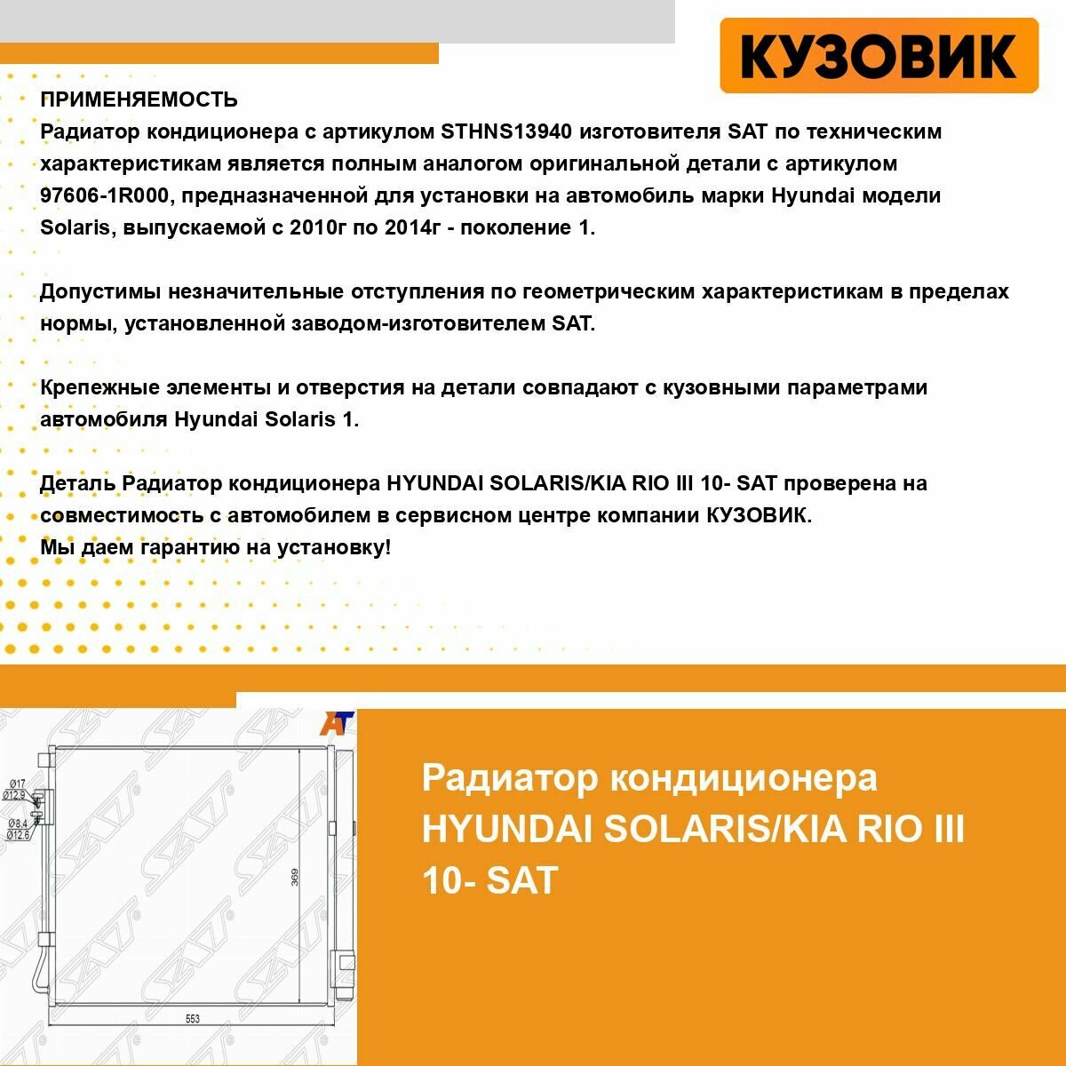 SAT STHNS13940 Радиатор HYUNDAI Solaris, i20, Accent, KIA Rio (2011-) кондиционера интересное: