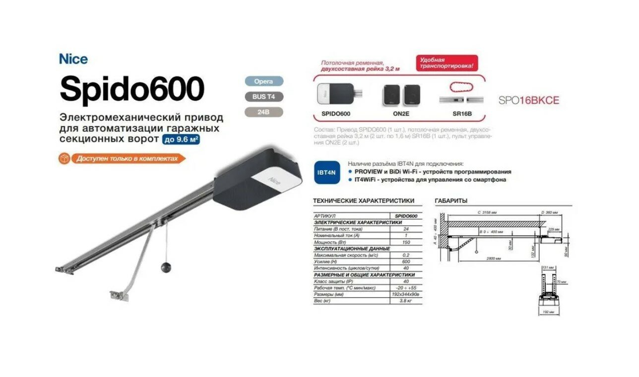 Комплект привода NICE SPO16BKCE SPIDO с ременной рейкой и 2мя пультами для секционных ворот площадью до 9,6м2