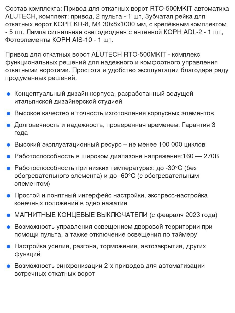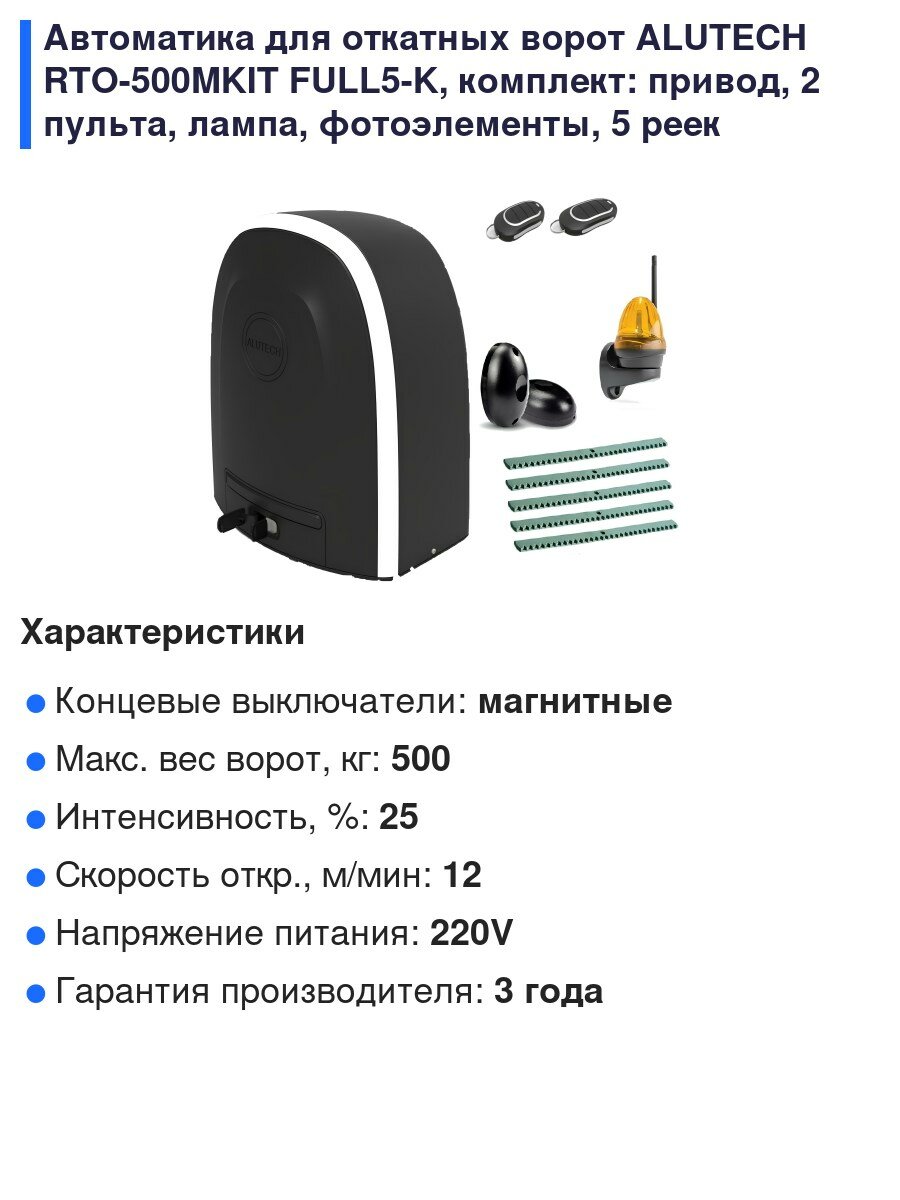 Автоматика для откатных ворот ALUTECH RTO-500MKIT FULL5-K, комплект: привод, 2 пульта, лампа, фотоэлементы, 5 реек интересное: