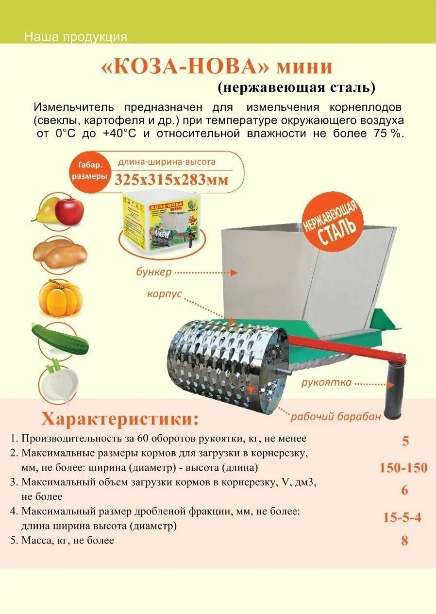 Корнерезка (измельчитель корнеплодов, овощей и фруктов) "Коза-Нова" мини / бункер из нержавеющей стали интересное: