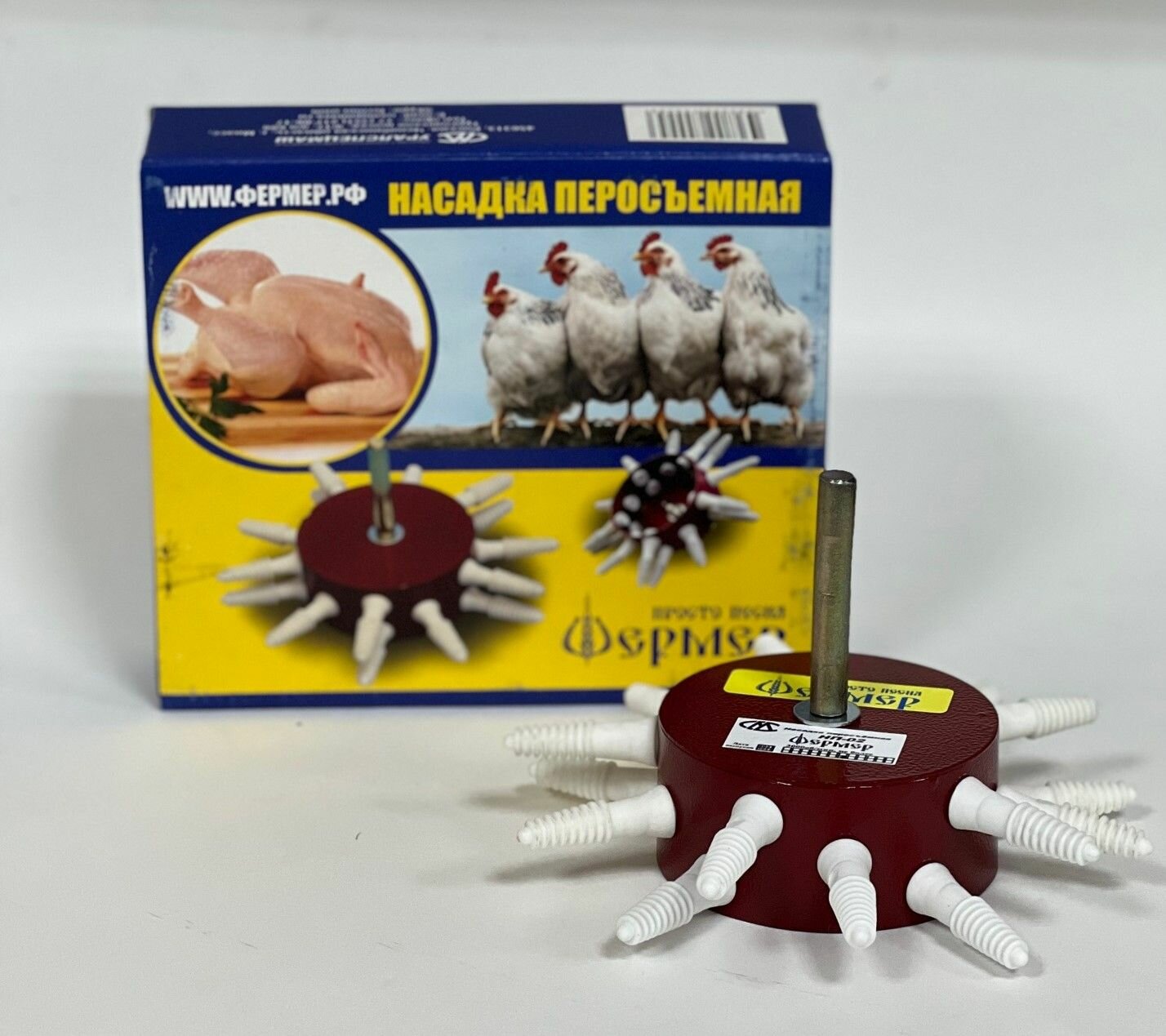 | Дополнительная информация | Перосъёмная насадка на дрель ёрш Фермер бильные пальцы для ощипывания домашней и дикой птицы Насадка перосъёмная на дрель ёрш машинка и бильные пальцы для ощипывания пера и пуха гуся, утки и другой домашней или дикой птицы и подробная инструкция по эксплуатации. Внимание! В России появились дешёвые китайские некачественные подделки перощипального оборудования под маркой Фермер! Опасайтесь таких подделок по низким ценам! Внимание! Каждому покупателю дополнительные бильные пальцы в подарок!!! |
