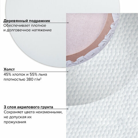 Холст/полотно на подрамнике для рисования 45% хлопок/55% лен, 40 см, круглый, грунтованный, среднее зерно, для работы масляными, акриловыми и темперными красками, Brauberg ART Classic