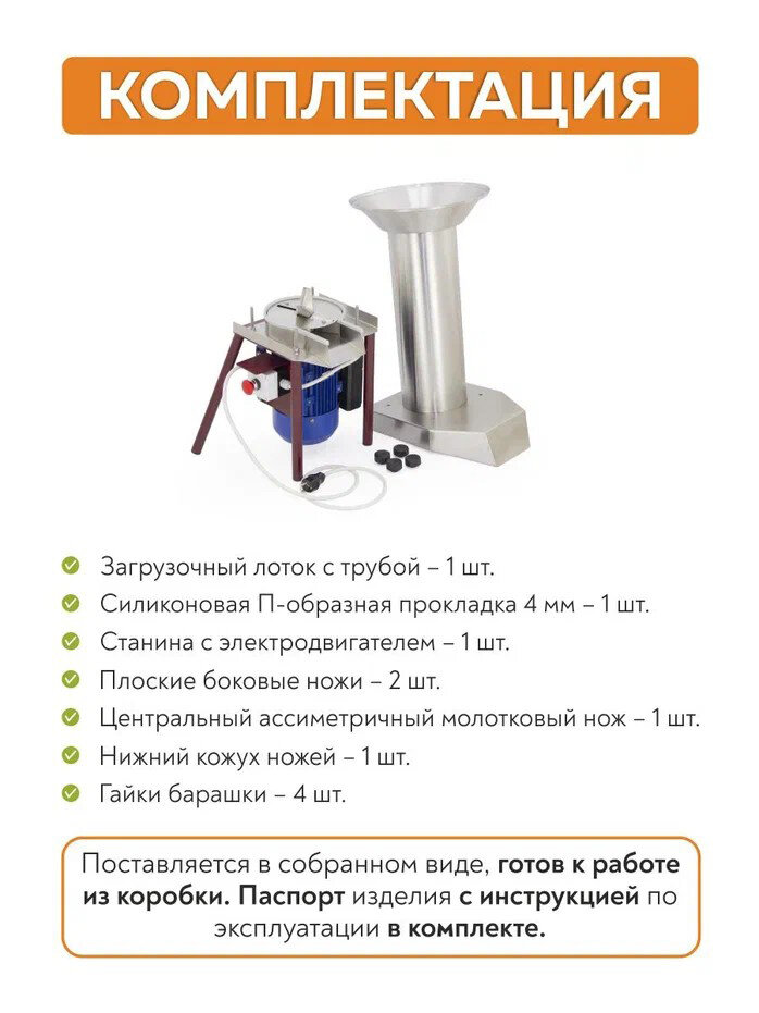 | Дополнительная информация | переработка в однородную мезгу; производительность: до 2,5 тонн готовой продукции за 1 час; работа от сети 220В |