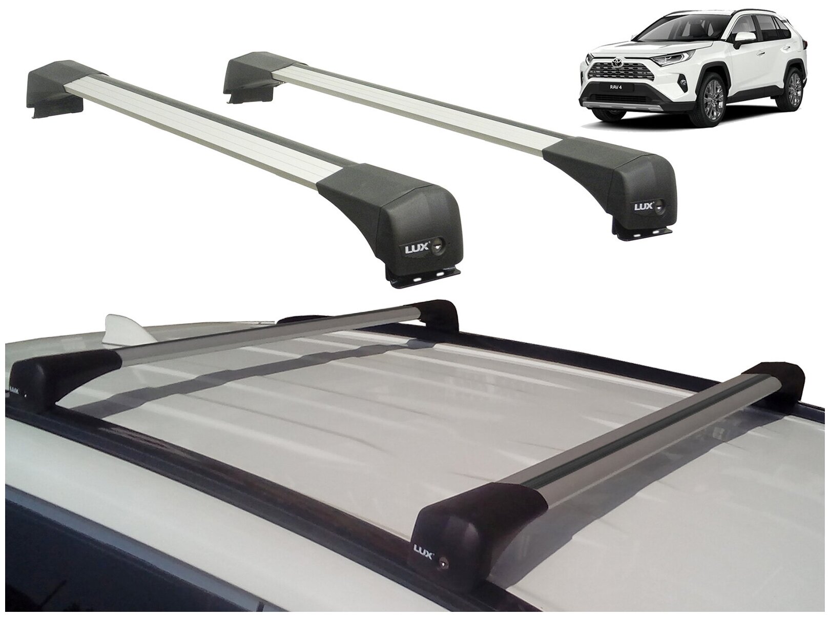 | Дополнительная информация | Бесшумная багажная система Lux Bridge (враспор, без вылетов) для Toyota RAV4 (с 2019 г), производство - Lux (Россия, Москва). Серебристые дуги. |