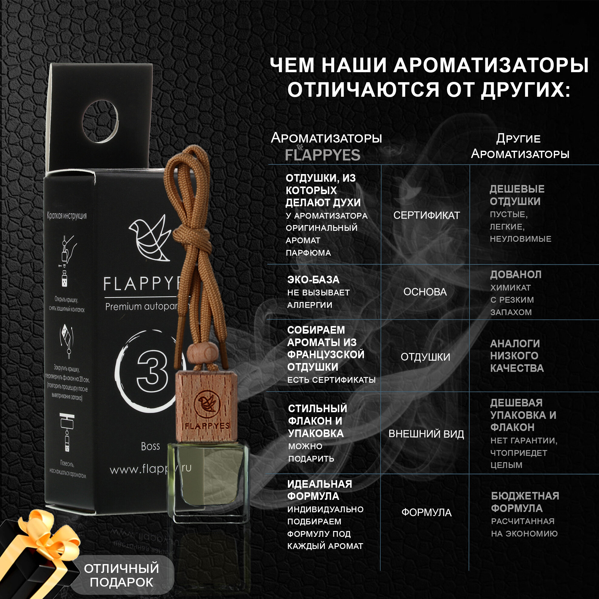 СохранитьАроматизатор для автомобиля и дома "Flappyes - Boss Bottled Intense" (Лёгкий аромат) / автопарфюм унисекс интересное: