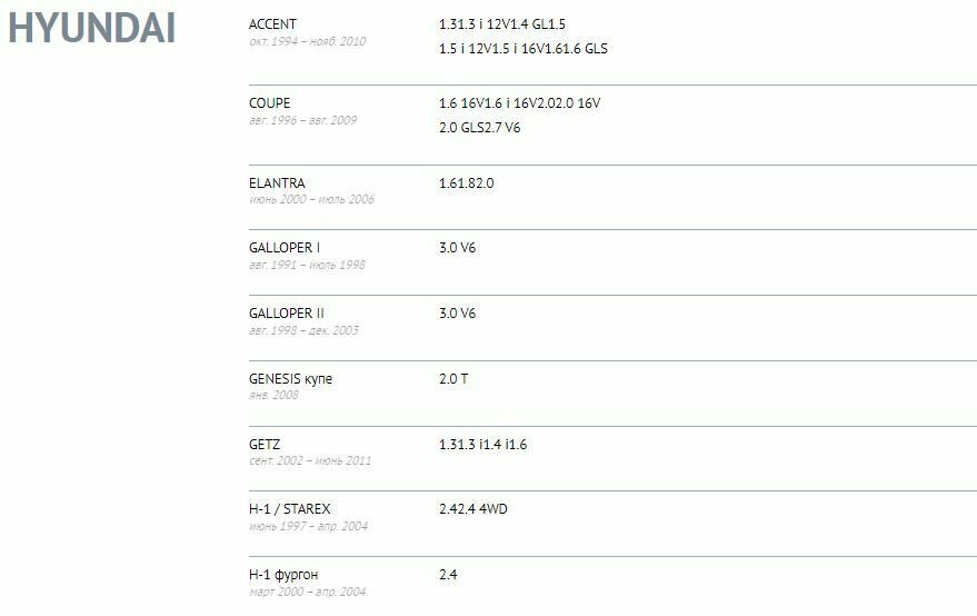 | Модель автомобиля | Hyundai Galloper / Hyundai Getz / Hyundai Solaris / Hyundai i10 / Hyundai i20 / Kia Carens / Kia Carnival / Kia Clarus / Kia Picanto / Kia Pride / Kia Rio / Kia Sephia / Kia Shuma / Kia Spectra / LADA Vesta / LADA X-RAY / Mazda 121 / Mazda 2 / Mazda 3 / Mazda 323 / Mazda 626 / Mazda Demio / Mazda MPV / Mazda MX-3 / Mazda MX-5 / Mazda Premacy / Mazda RX-8 / Mazda Xedos / Mitsubishi Pajero / Nissan Almera / Nissan Almera Classic / Nissan Juke / Nissan Kubistar / Nissan Note / Nissan Primera / Nissan Qashqai / Nissan Qashqai+2 / Nissan Tiida / Nissan X-Trail / Renault Clio / Renault Duster / Renault Espace / Renault Kangoo / Renault Kaptur / Renault Laguna / Renault Modus / Renault Twingo / Renault Vel Satis / Subaru Forester / Subaru Impreza / Subaru Justy / Subaru Legacy / Subaru Libero / Subaru Outback / Subaru Vivio |