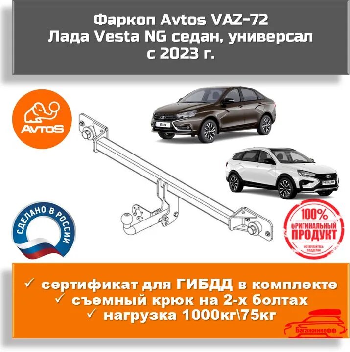 Фаркоп Avtos VAZ-72 для Лада Vesta NG седан, универсал с 2023 года выпуска (паспорт и сертификат в комплекте) интересное: