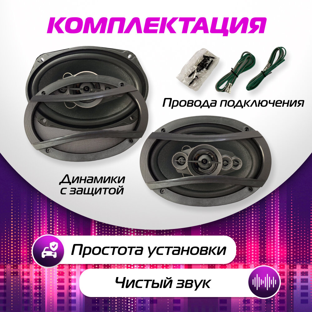 | Комплектация | Комплектация · Динамики автомобильные 2 шт. · Защитные сетки 2 шт. · Провода для подключения · Крепления для саморезов 8 шт. · Саморезы для акустики 8 шт. |