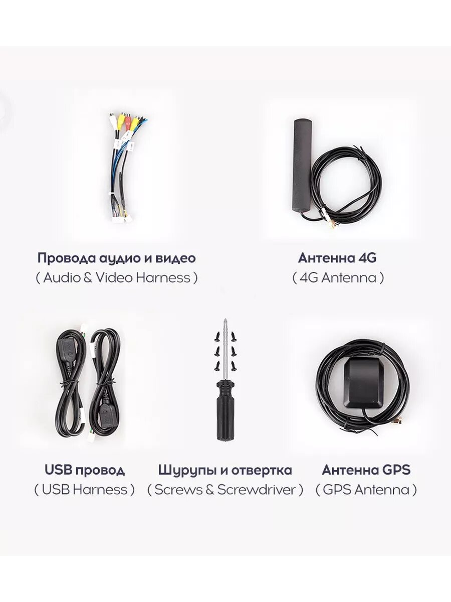 | Подробная комплектация | Одинарный USB вход-2 шт, GPS антенна-1 шт, кабель основного питания, вход сигнала камеры заднего хода, разъём радио антенны, WI-FI антенна, отвертка с болтиками для крепления магнитол, 4G антенна, многофункциональные аудио-видео разъём. |