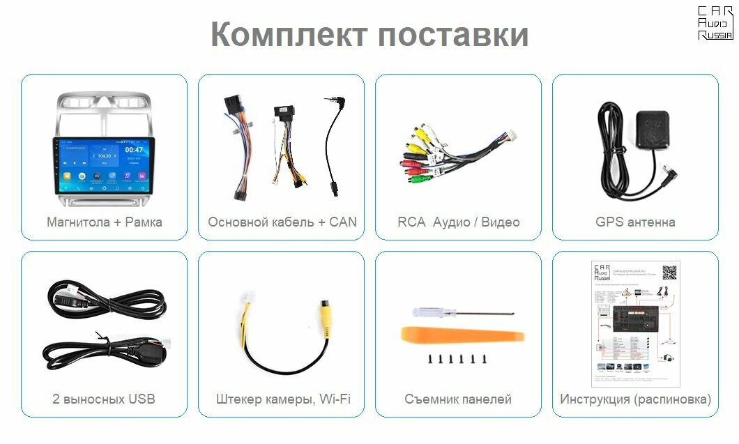 | Подробная комплектация | В комплекте переходная рамка, кабель питания и звука (разъем Peugeot), RCA (линейные выхода и входа), штекер для камеры заднего вида, 2 кабеля USB, универсальные крепления, GPS антенна, инструкция-распиновка подключения на русском языке. |
