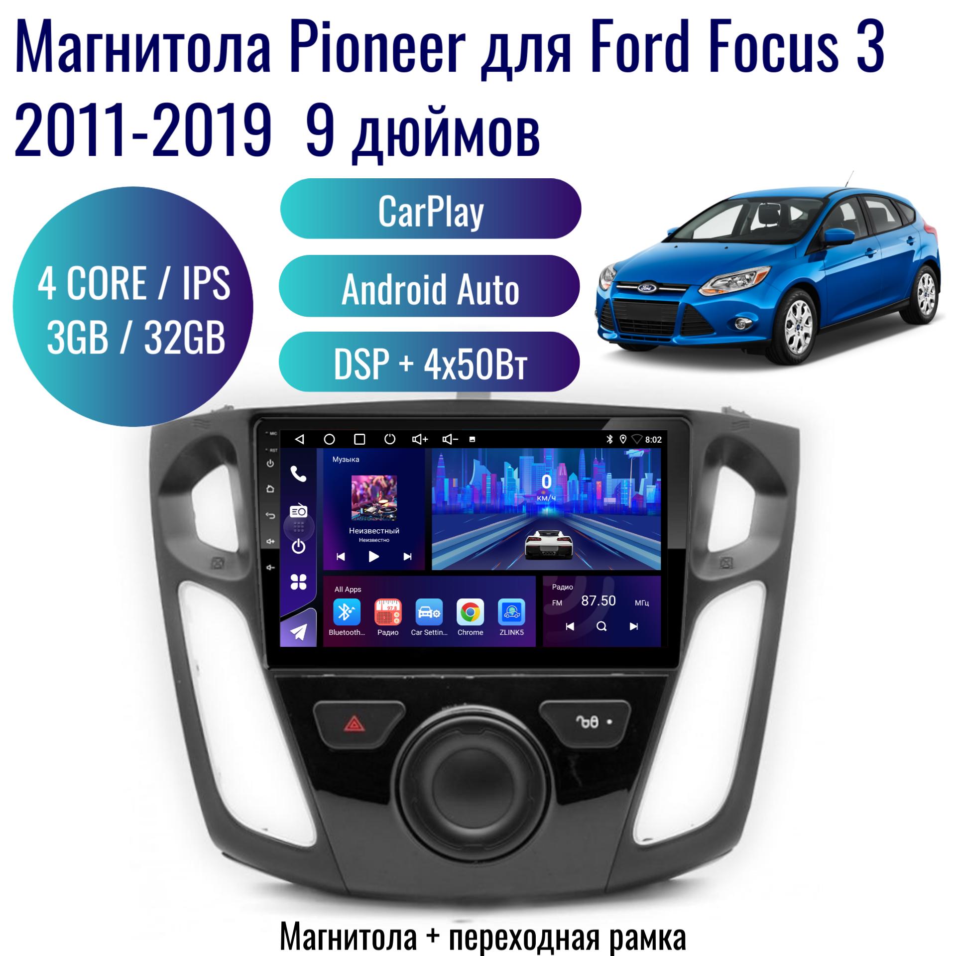 Автомагнитола Pioneer Android Ford Focus 3 2011-2019 / 4 ядер 3Gb+32Gb / 9 дюймов / GPS / Bluetooth / Wi-Fi / 2din / ШГУ
