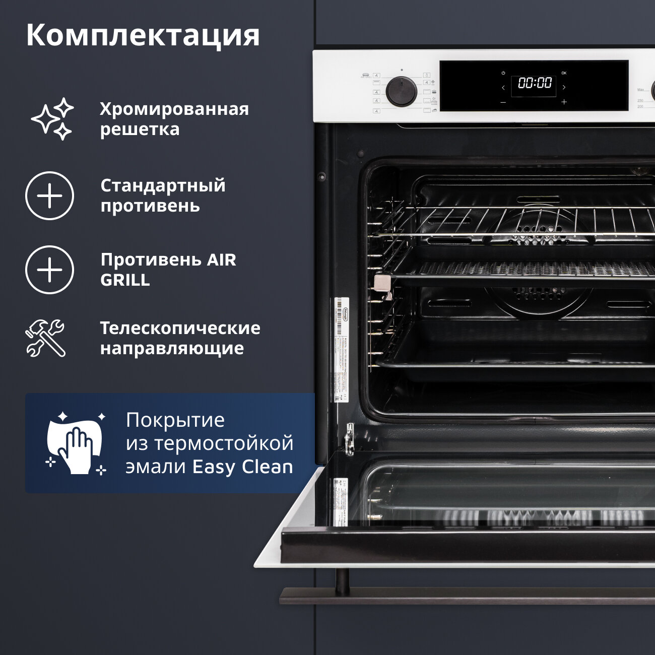| Подробная комплектация | Перфорированный противень для AIR GRILL, глубокий противень с антипригарным покрытием, хромированная решётка |