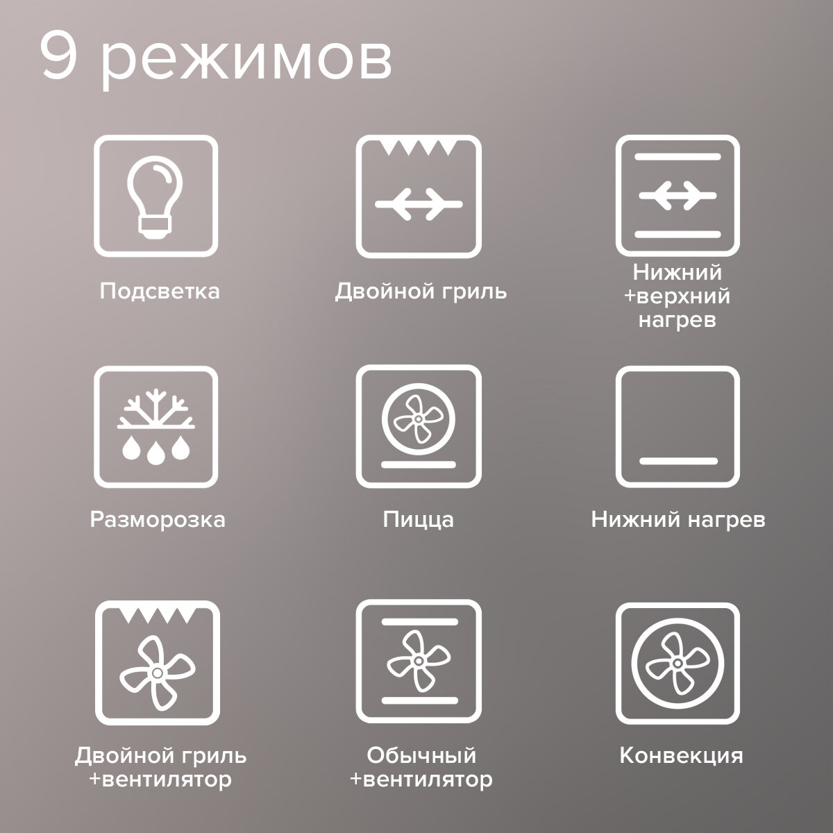 | Режимы нагрева | верхний нагрев, верхний нагрев + конвекция, верхний нагрев + нижний нагрев, верхний нагрев + нижний нагрев + конвекция, гриль + конвекция, конвекция, нижний нагрев, нижний нагрев + конвекция |