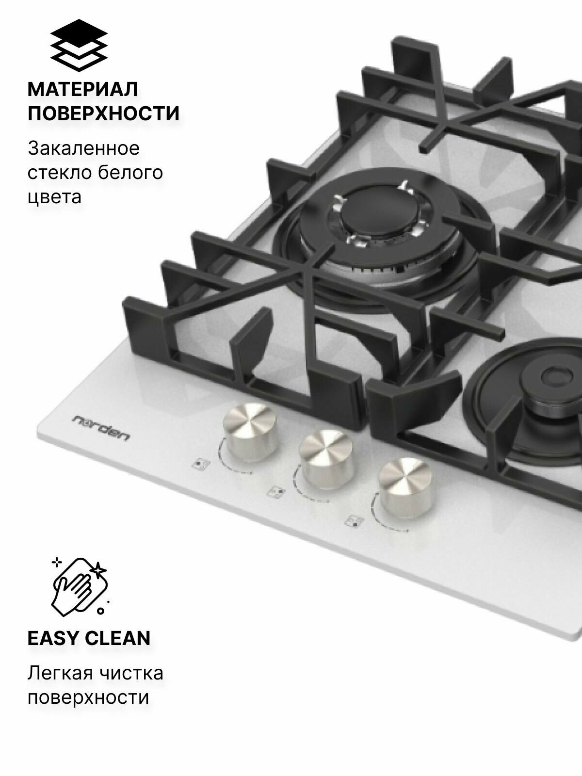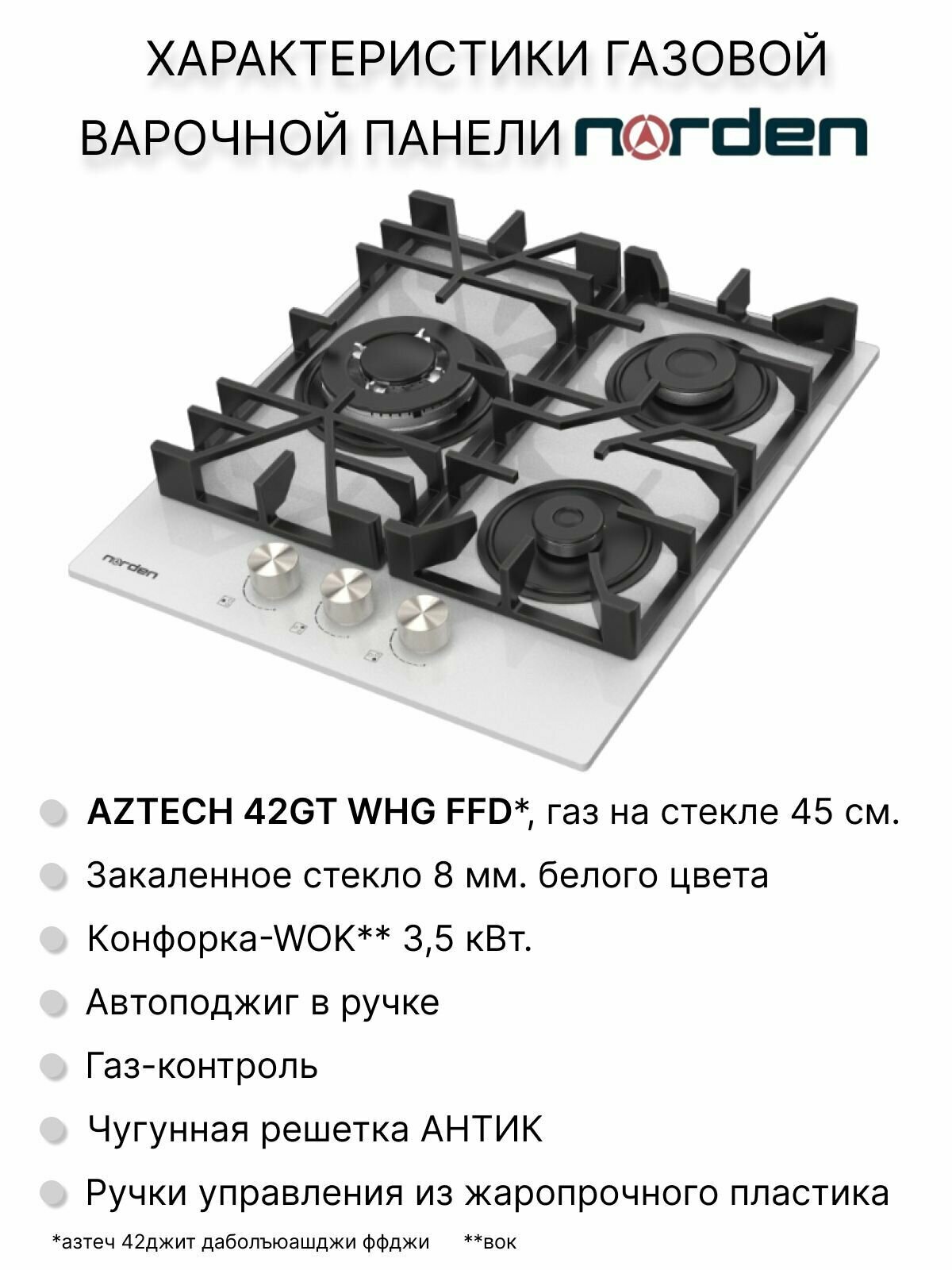 Варочная панель газовая Norden AZTECH 42GT WHG FFD с автоподжигом 45 см, газконтроль, конфорка WOK, закаленное стекло белого цвета интересное: