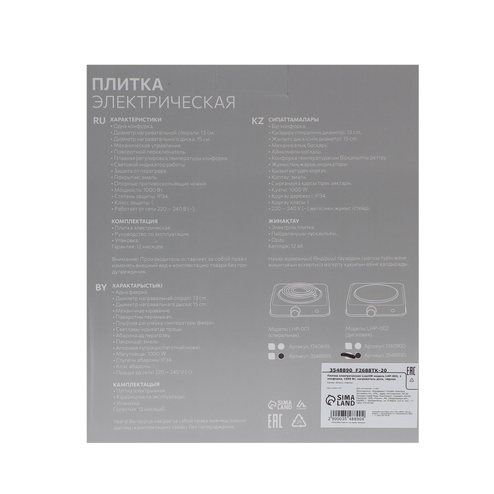Купить Плитка электрическая LuazON LHP-002, 1 конфорка, 1000 Вт, нагреватель диск, чёрная Luazon Home 35488 .