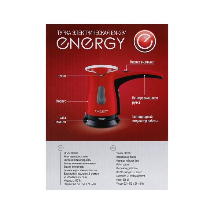 Турка электрическая Energy EN-294, 500 Вт, 0.5 л, красная