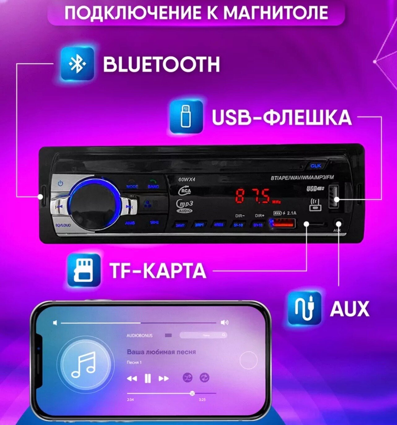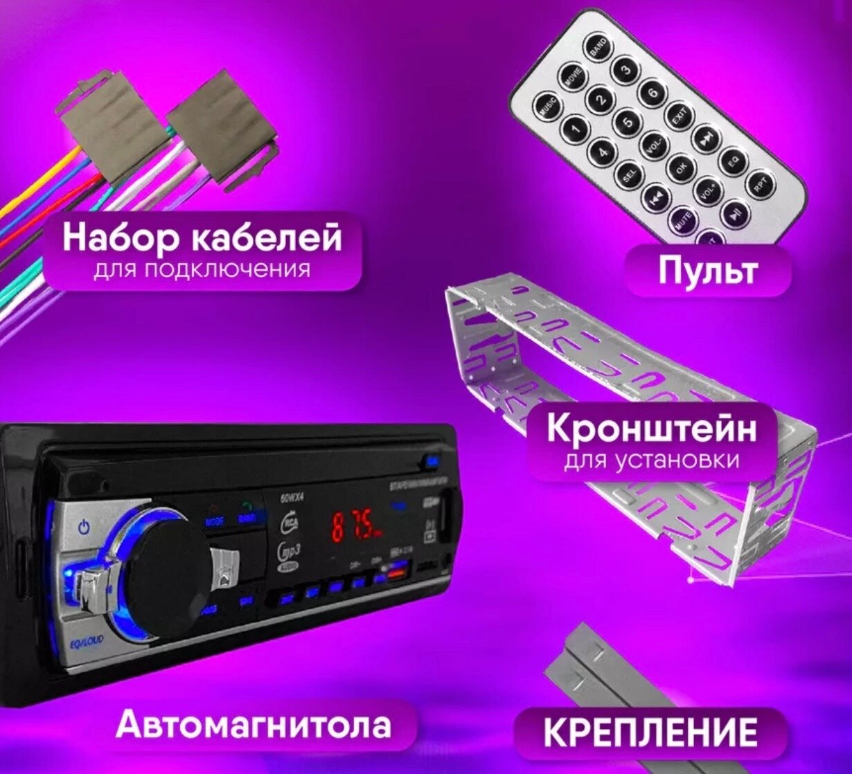 Магнитола с Bluetooth и USB, 1DIN, 45Вт, черный интересное: