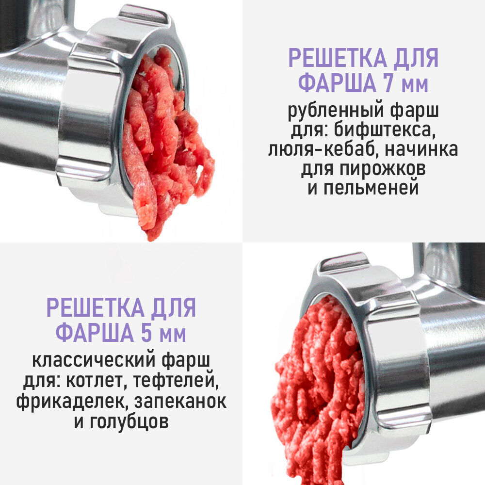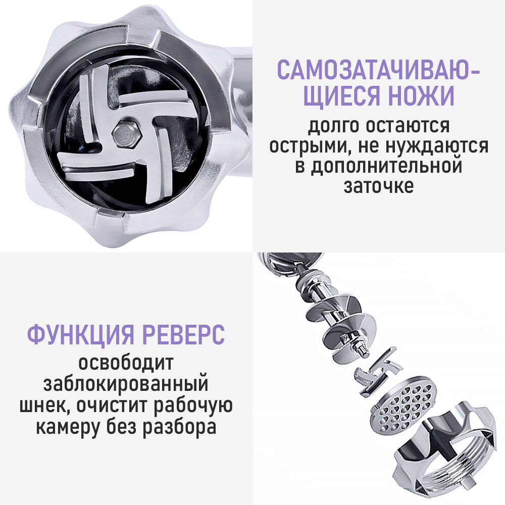 | Насадки | диск для фарша / насадка для кеббе / насадка для приготовления колбас / насадка для шинковки / насадка-терка / соковыжималка |