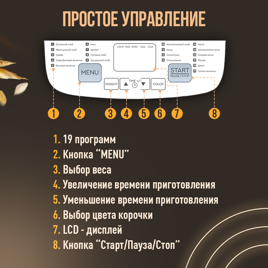 | Особенности | выбор цвета корочки / поддержание температуры / регулировка веса выпечки / таймер |