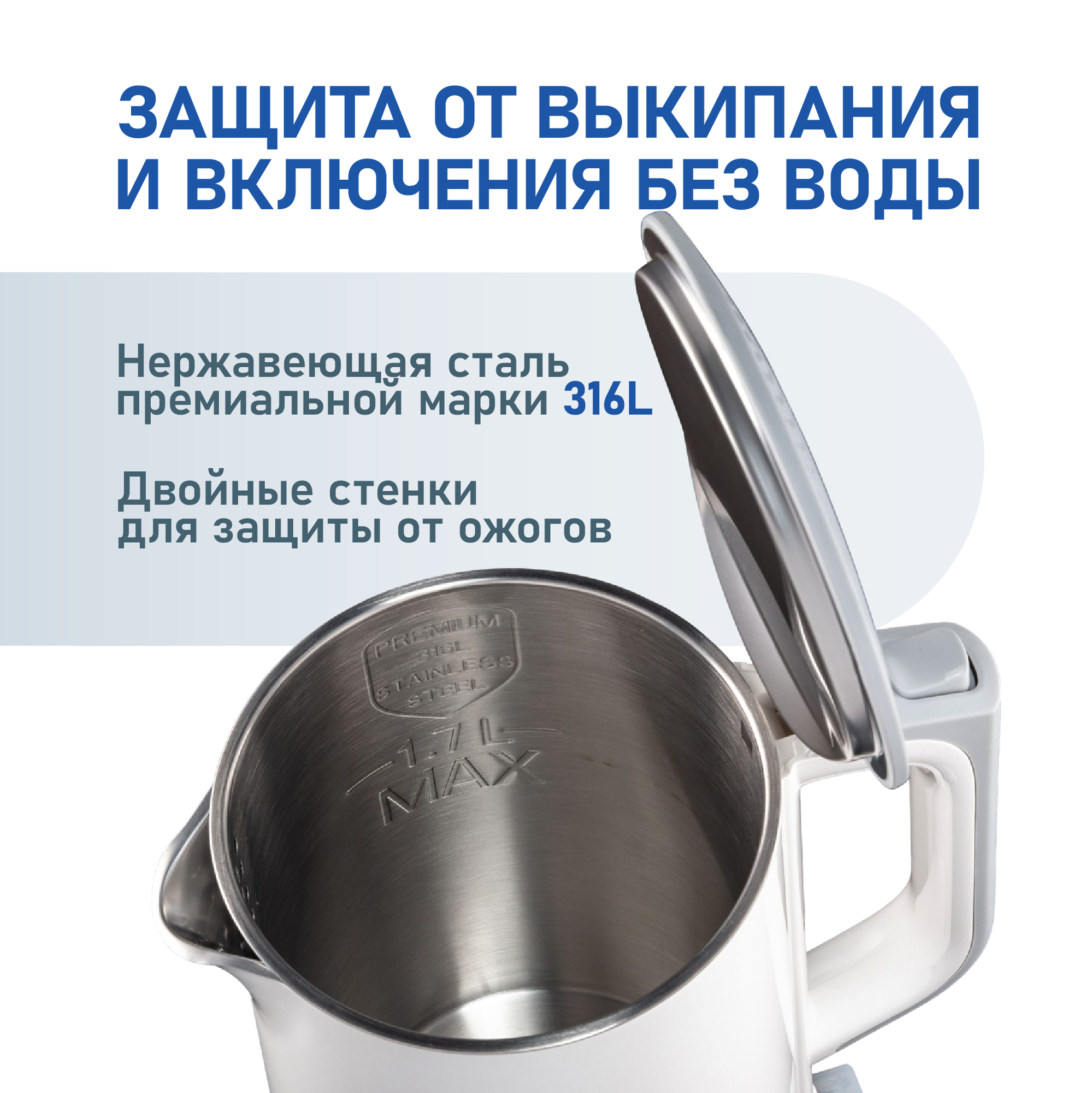 | Безопасность | блокировка включения без воды / отключение при снятии с подставки |