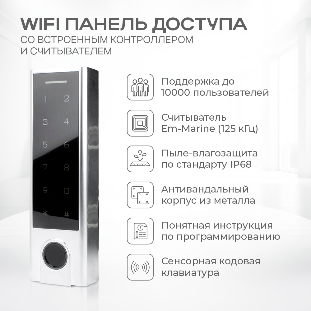 | Подробная комплектация | Электронная панель HF3-WF - 1 шт.; Мастер-ключ - 1 шт.; Монтажный комплект - 1 шт.; Электро замок AT-L-1EM/CH - 1 шт.; RFID ключи - 4 шт.; Блок питания 12В-2А - 1 шт.; Инструкция - 1 шт. |