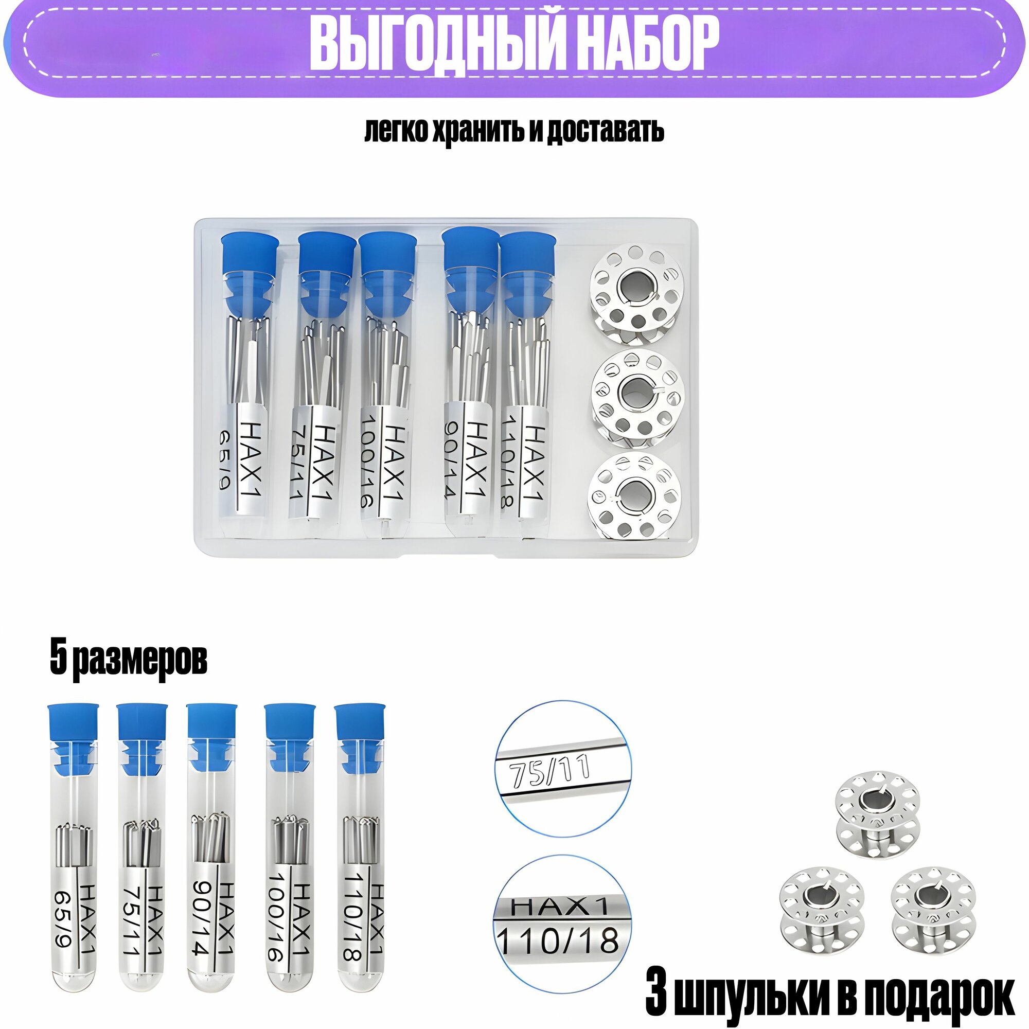 | Подробная комплектация | 100 универсальных игл разного размера |