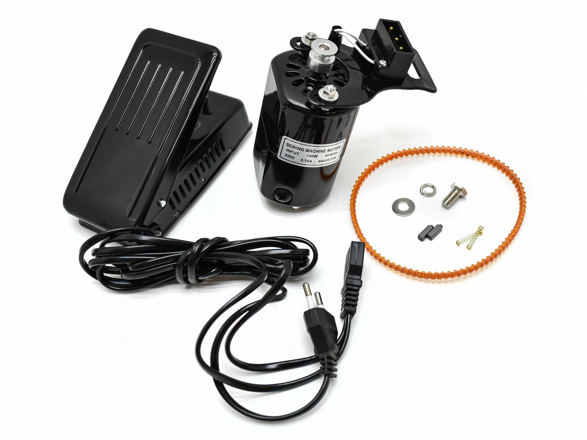 | Дополнительная информация | Двигатель швейной машинки, КОМПЛЕКТ в сборе с педалью, ремнем, запасными щетками и крепежом 150W |