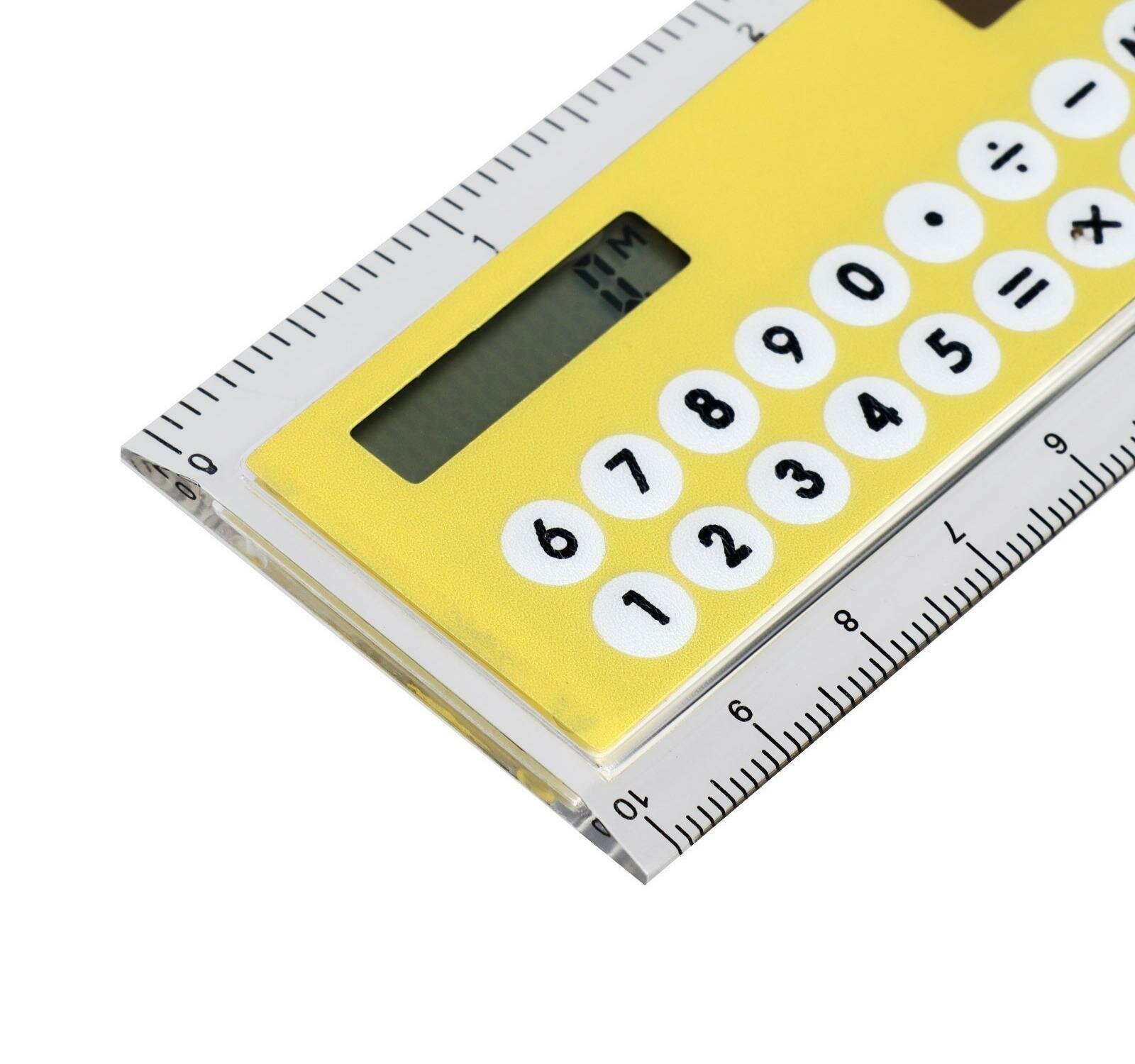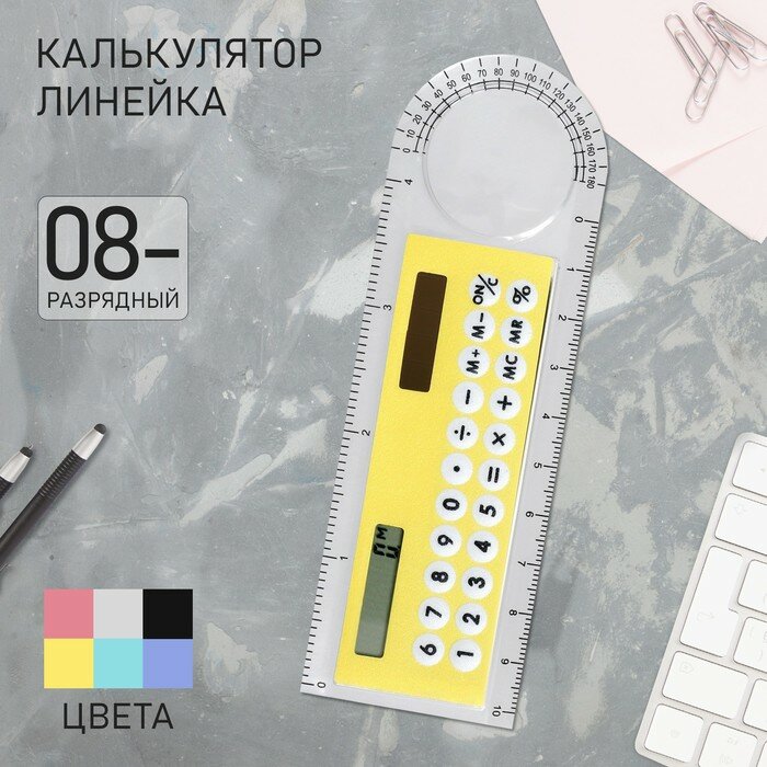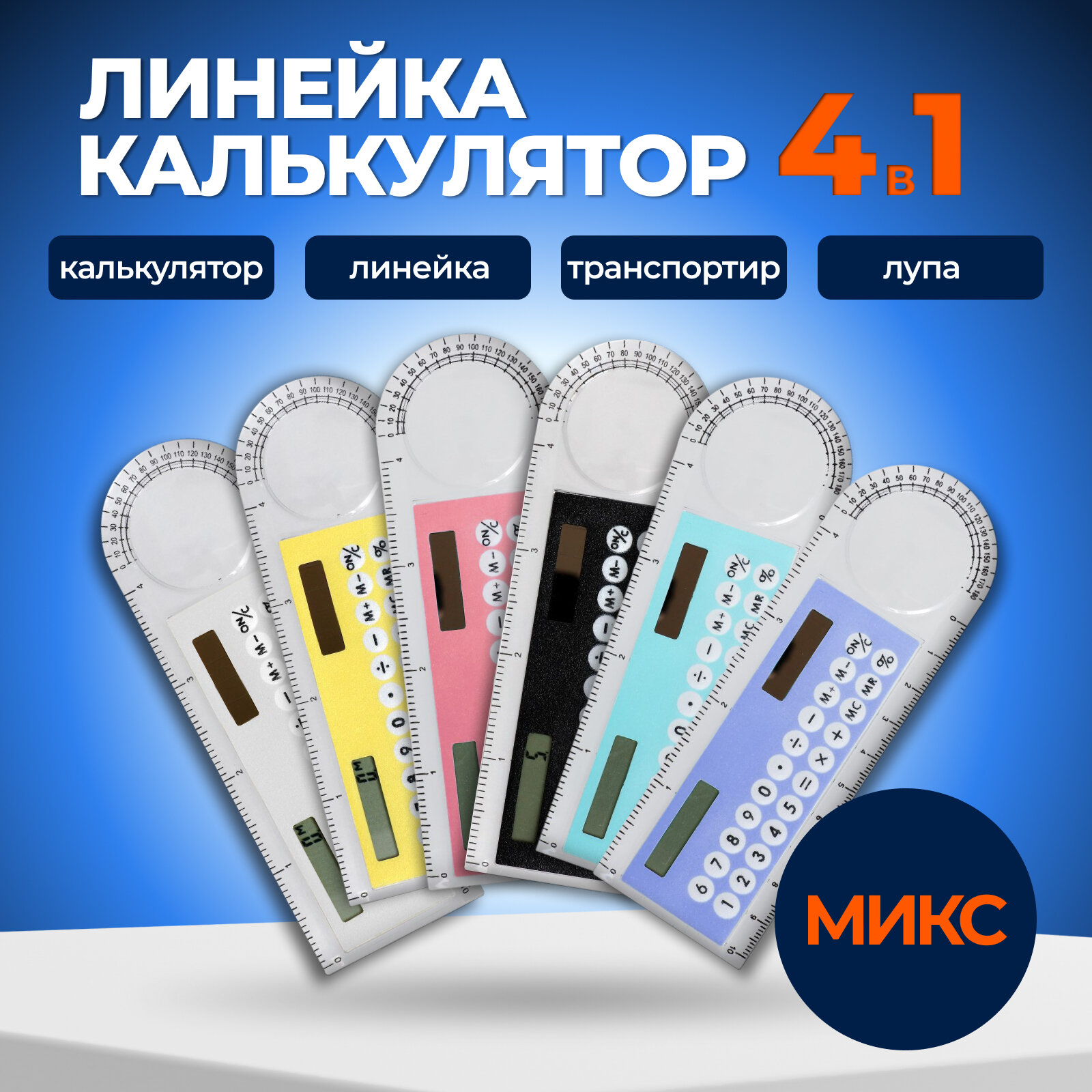 Калькулятор - линейка, 10 см, 8 - разрядный, корпус прозрачного цвета, с транспортиром, работает от света, микс