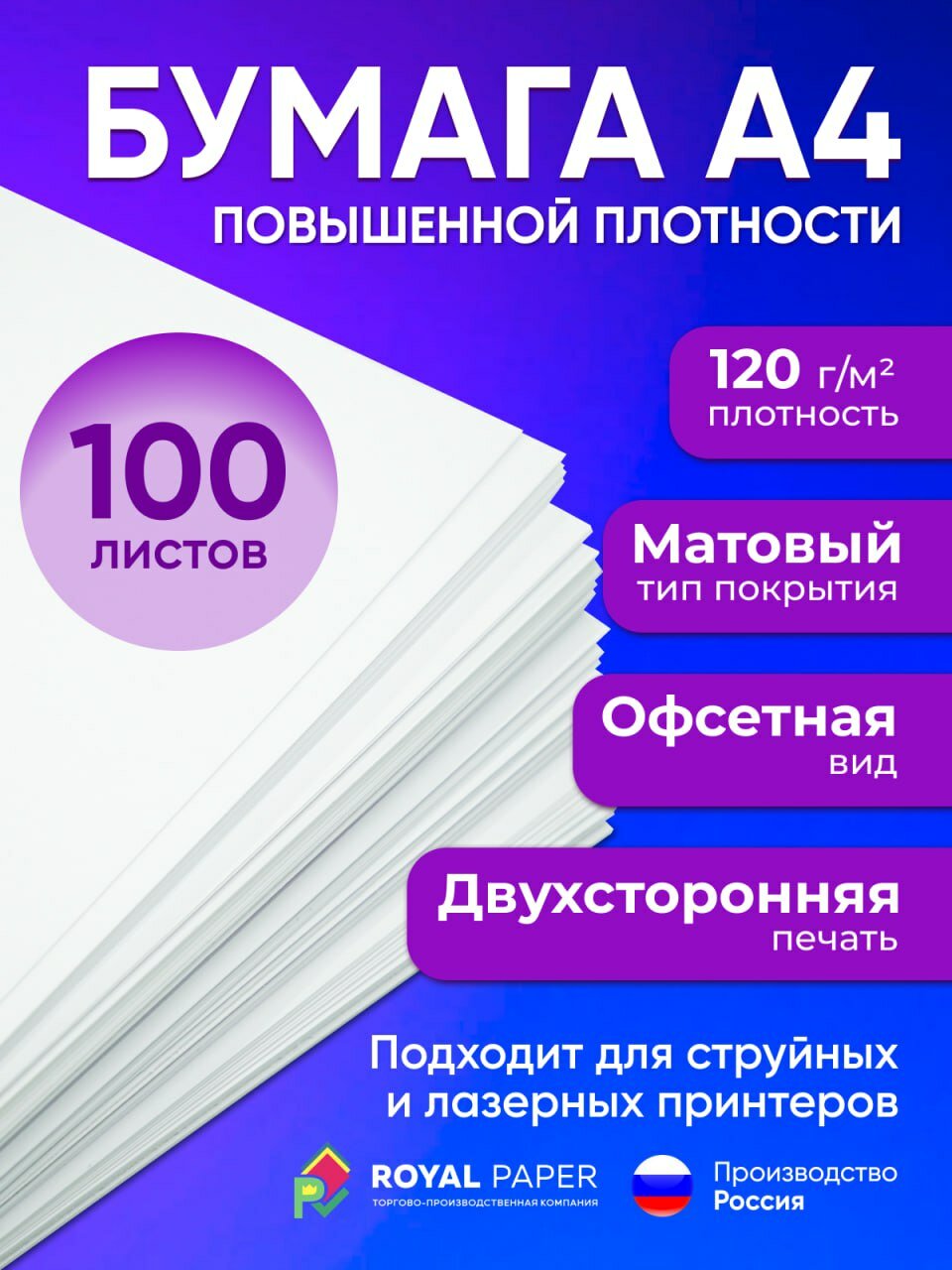 Купить Бумага А4 плотная 120 г/м2, 100 листов, двухсторонняя, офсетная (подходит для печати на струйном и лазерном принтере)