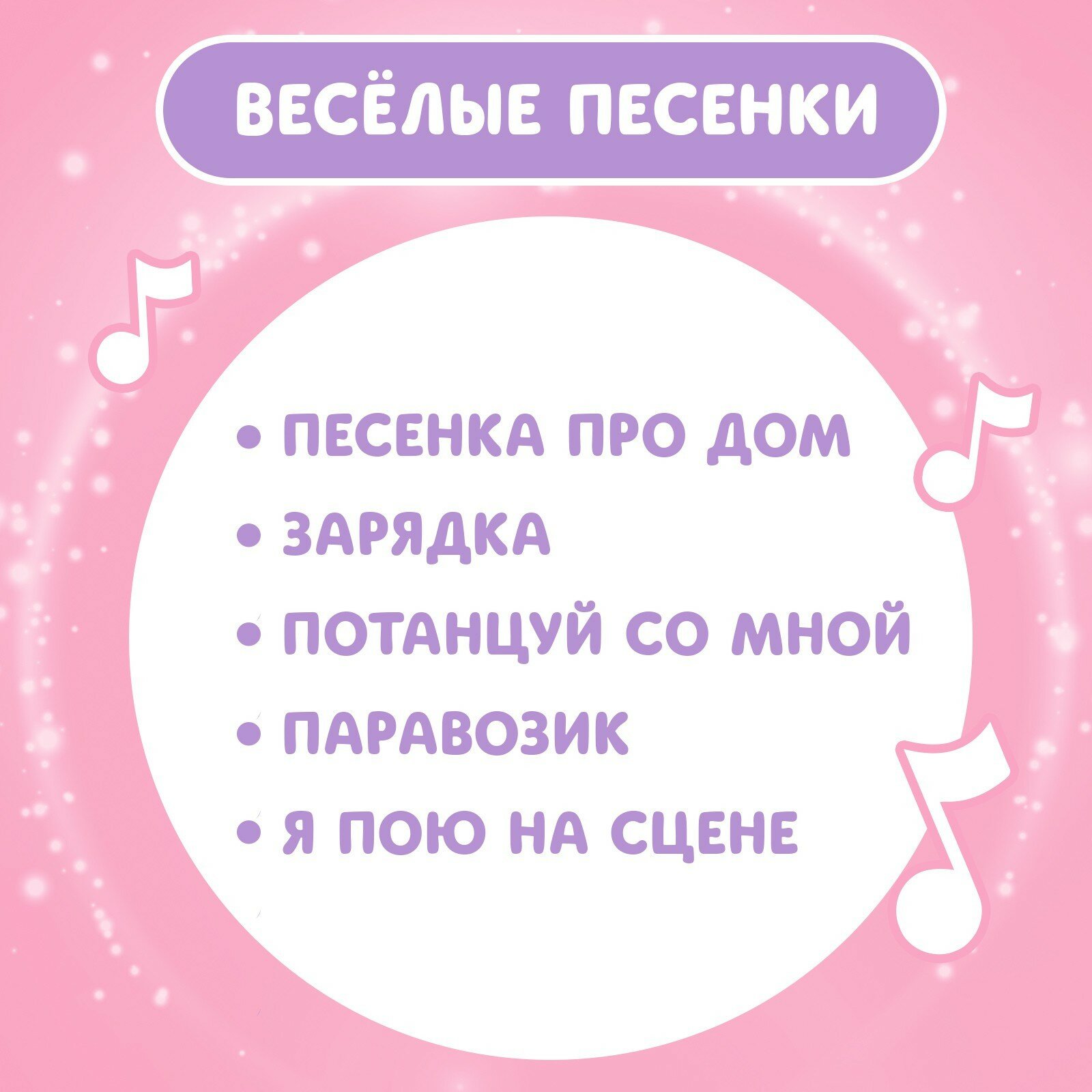 | Дополнительная информация | Воспроизводит песенки: «Песенка про дом» «Зарядка» «Потанцуй со мной» «Паравозик» «Я пою на сцене» |