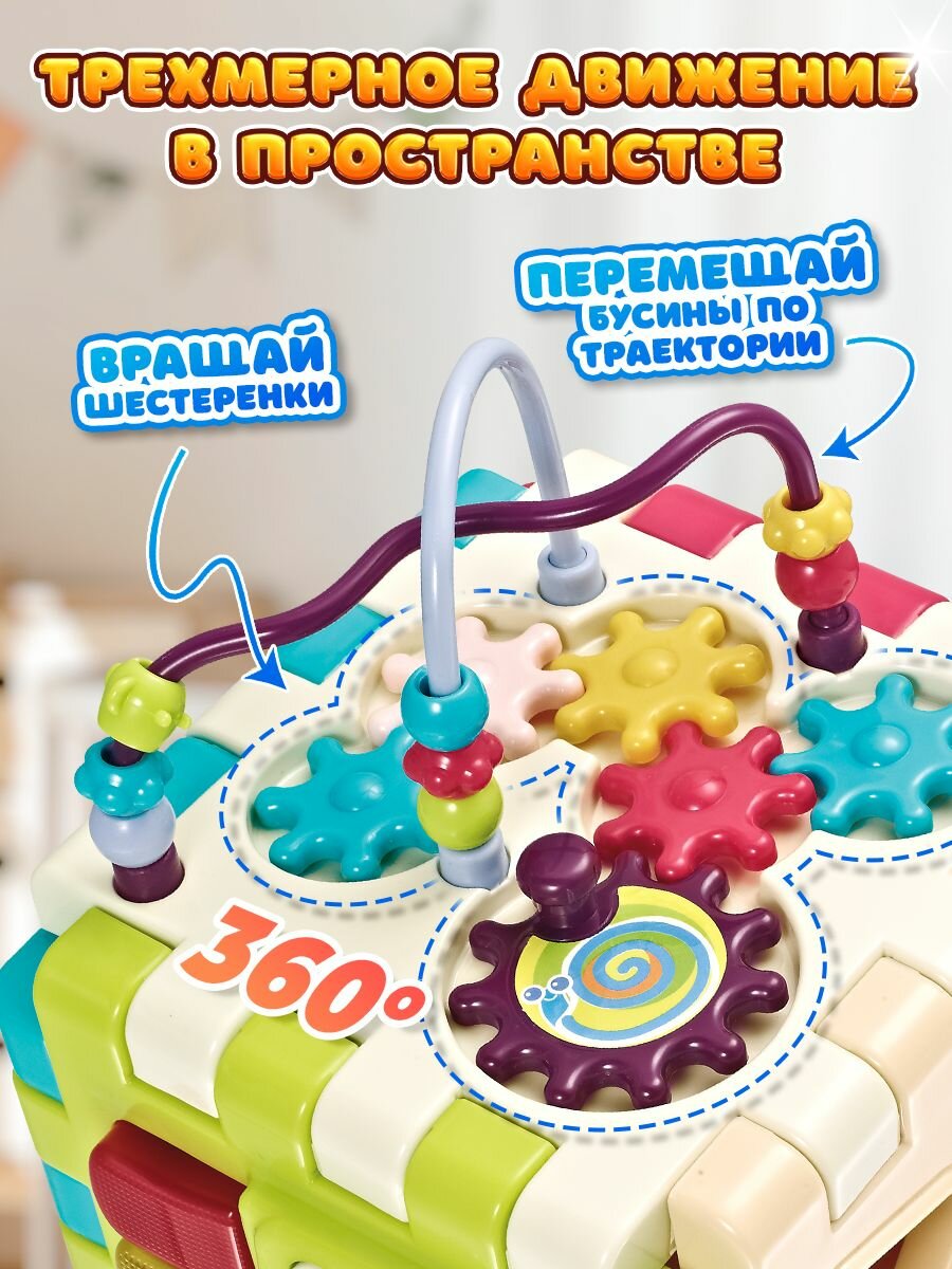Сортер Куб по монтессори развивающий для малышей с резинками и геометрическими фигурами по цветам музыкальный