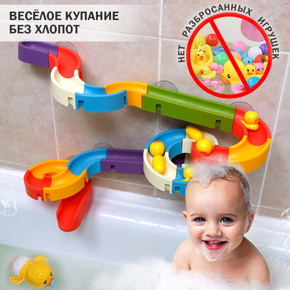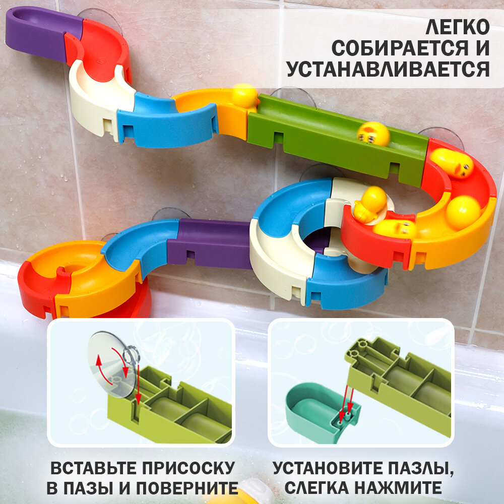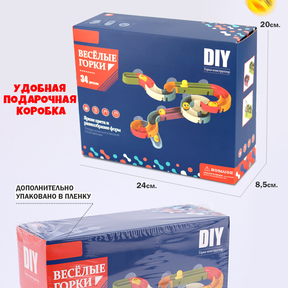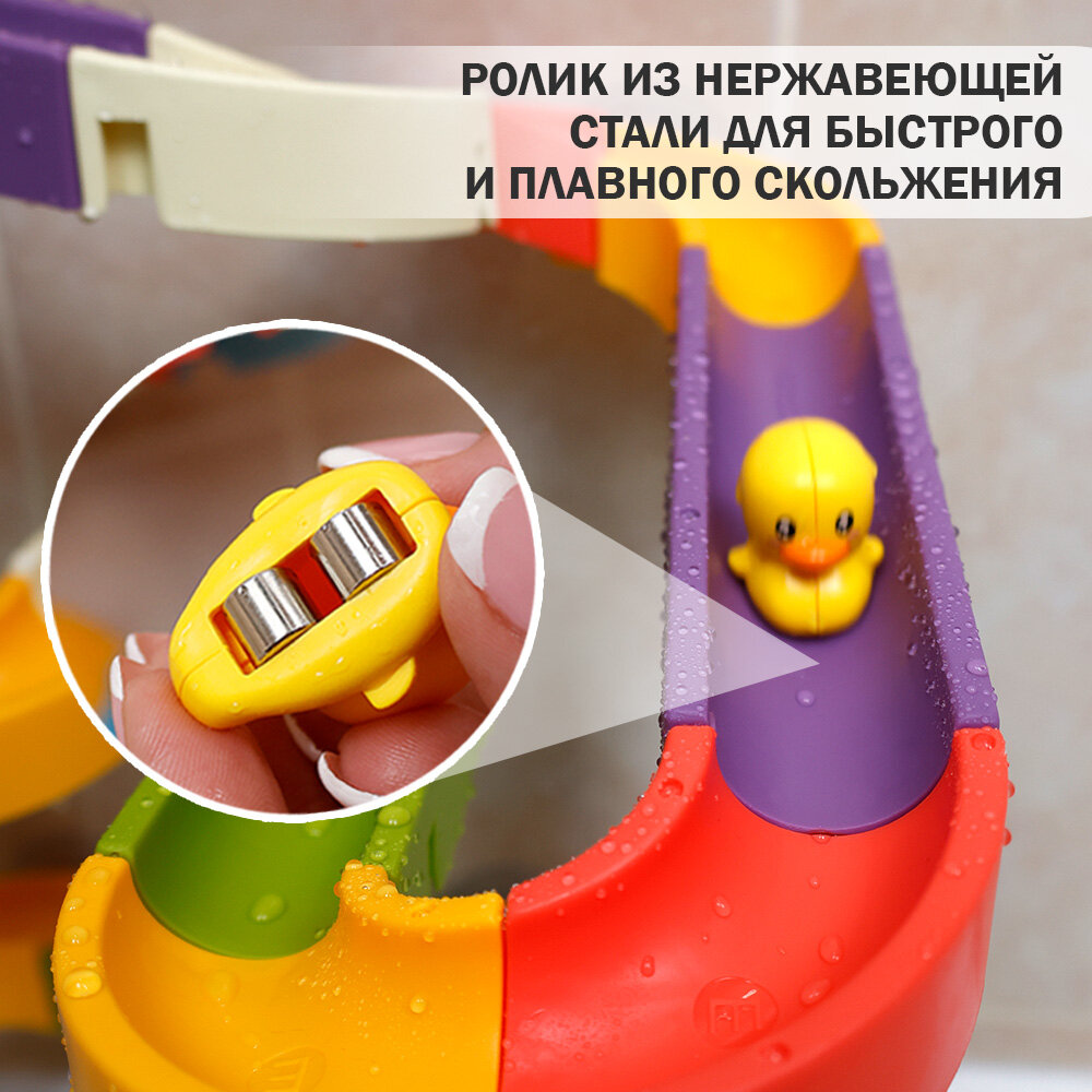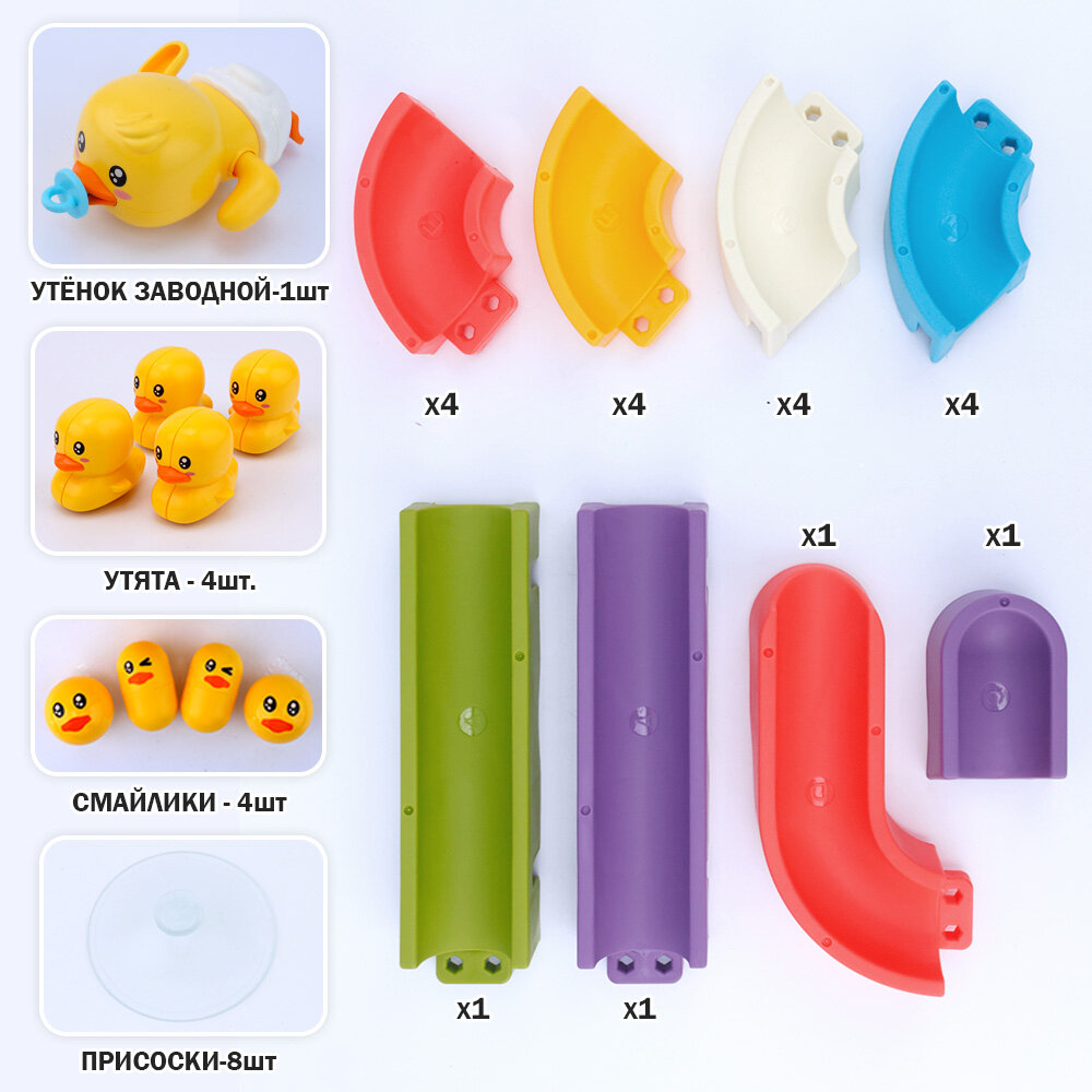 | Комплектация | Прямые длинные элементы горки 8шт.; Прямой длинный элемент горки с поворотом 1шт.; Завершающий элемент горки 2шт.; Поворотные элементы горки 36шт.; Уточка на роликах 2шт.; Весёлая капсула 2шт.; Шарик-смайлик 2шт.; Стакан-лейка 1шт.; Колесо-мельница 2шт.; Крепкие присоски 14шт.; Заводная уточка 1шт.; Упаковка - Красивая подарочная коробка. |