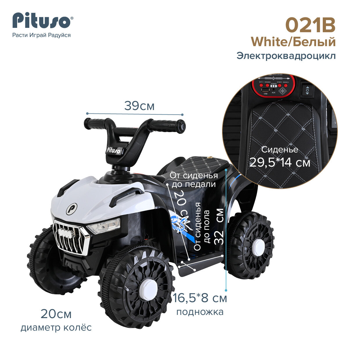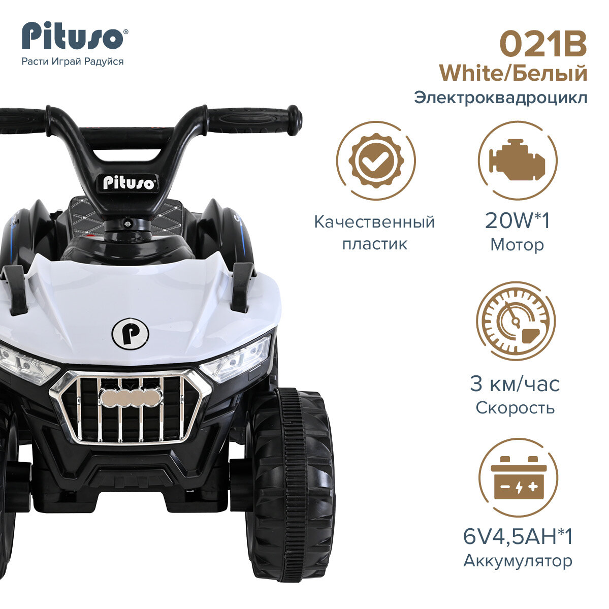 Ниже Вы можете прочитать отзывы на Детский электромобиль Pituso Квадроцикл 021B со светом и звуком, 6V/4,5Ah,20W, белый, ознакомится с подробными характеристиками, посмотреть интересные обзоры и фотографии на Детский электромобиль Pituso Квадроцикл 021B со светом и звуком, 6V/4,5Ah,20W, белый.