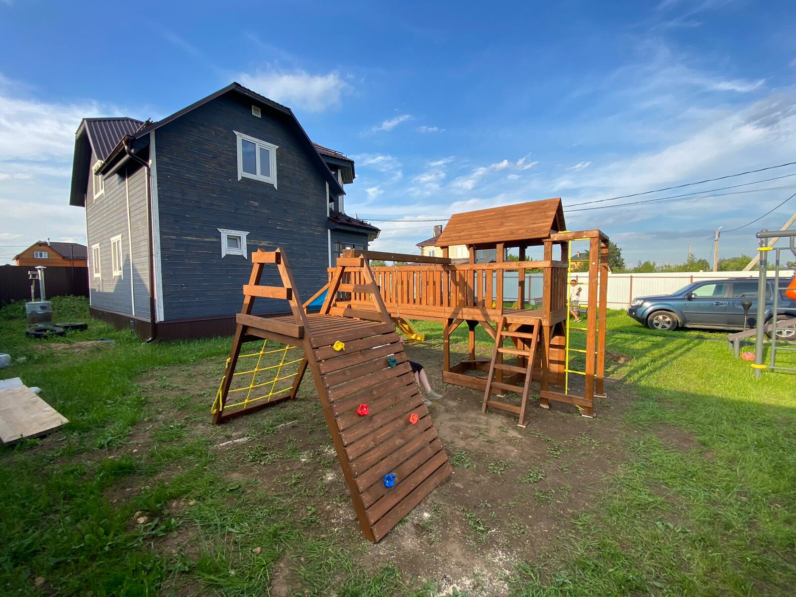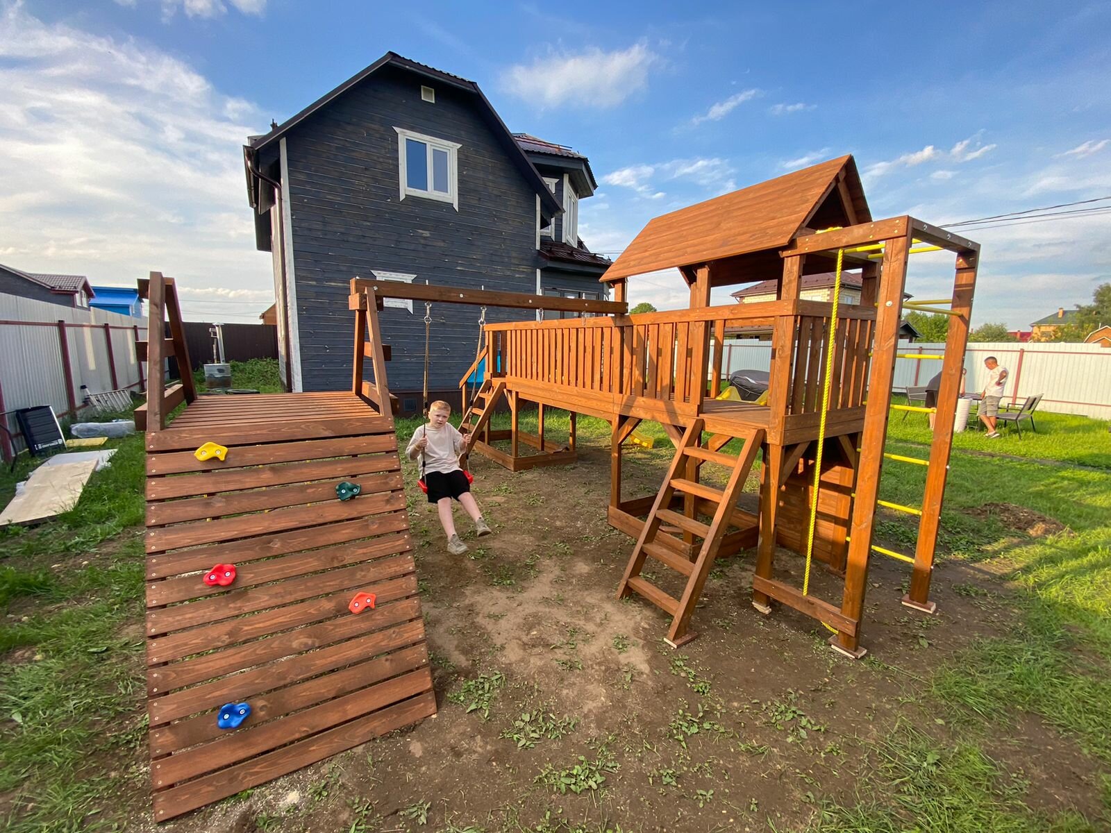 | В комплекте | баскетбольное кольцо, брусья, горка, домик, канатный лаз, качели, лестница, мостик, песочница, рукоход, скалолазная стенка, турник |