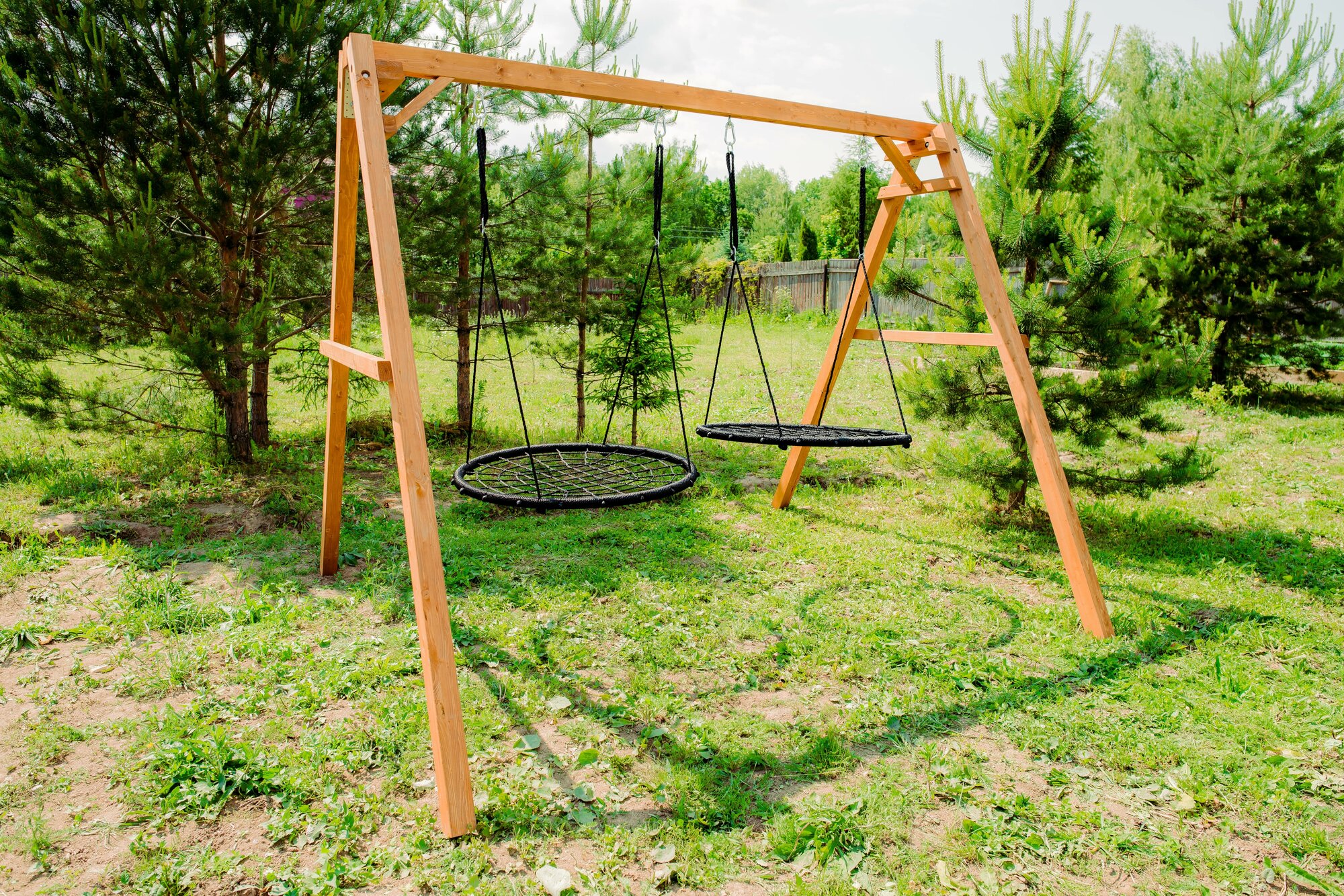 Детские деревянные качели для дачи - окрашенные. Качель детская уличная для ребенка с двумя гнездами 100 см интересное: