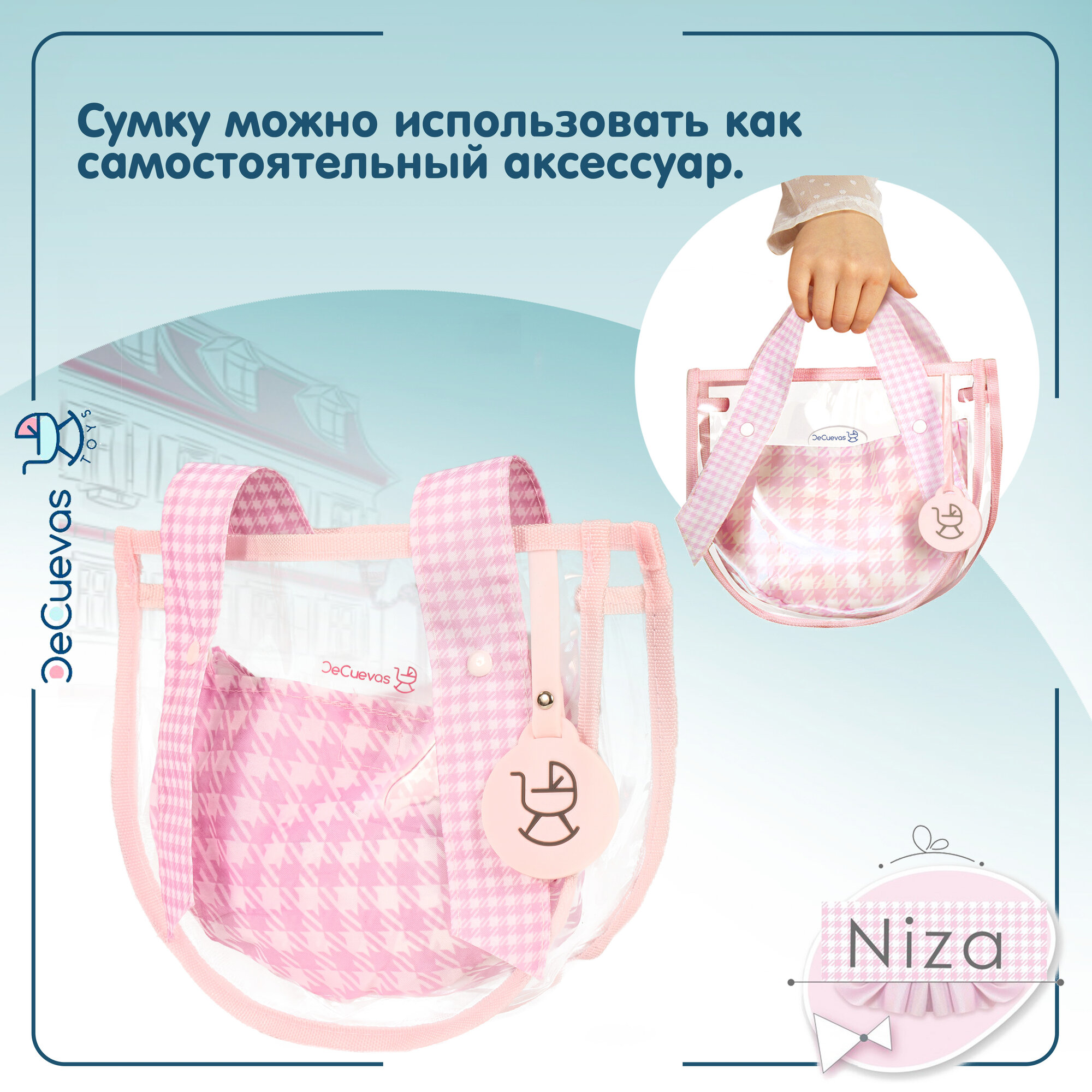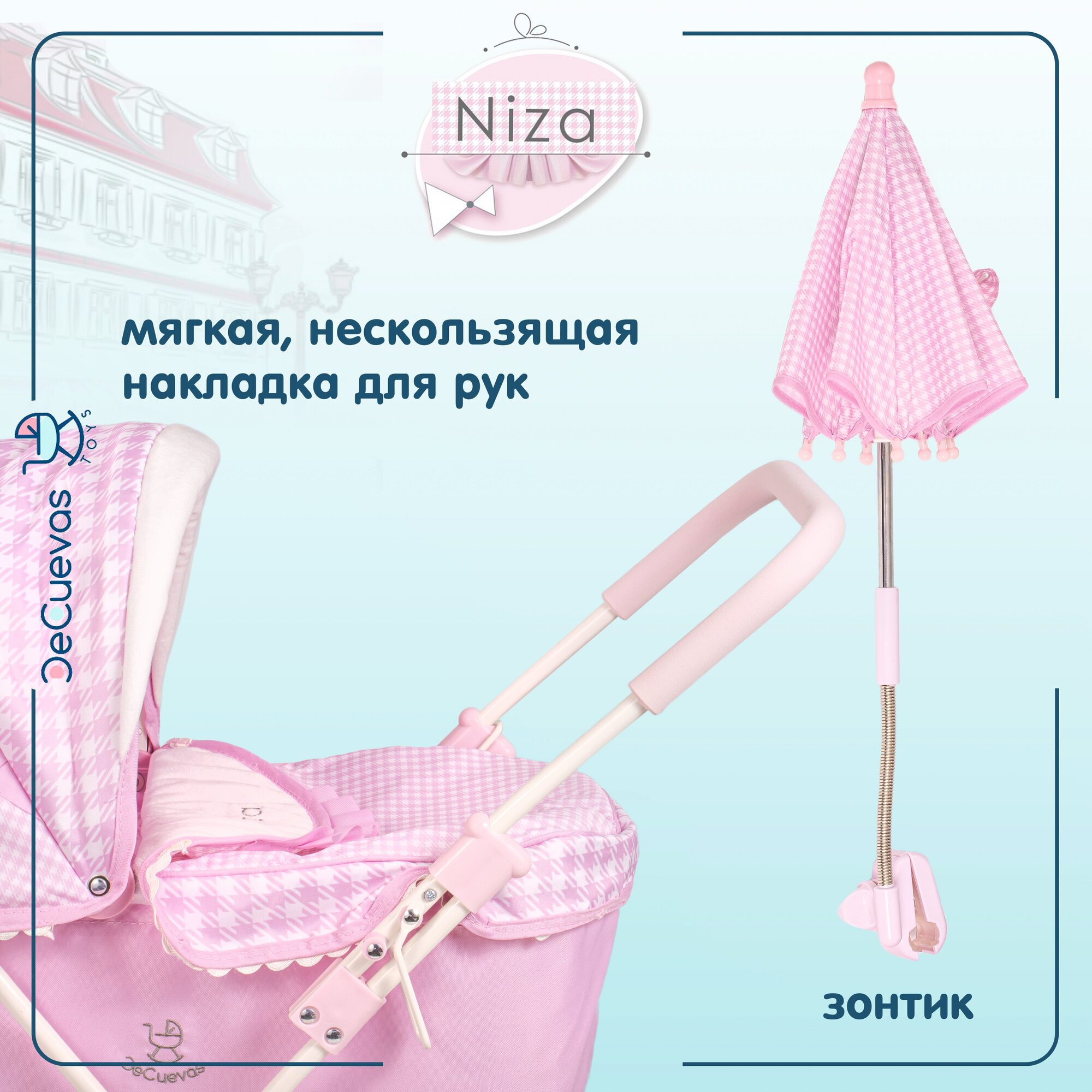 Коляска для кукол люлька 85046 DeCuevas Toys, с аксессуарами съемной прозрачной сумкой и зонтом, высота ручки 60 см, серия Ницца, классический дизайн интересное: