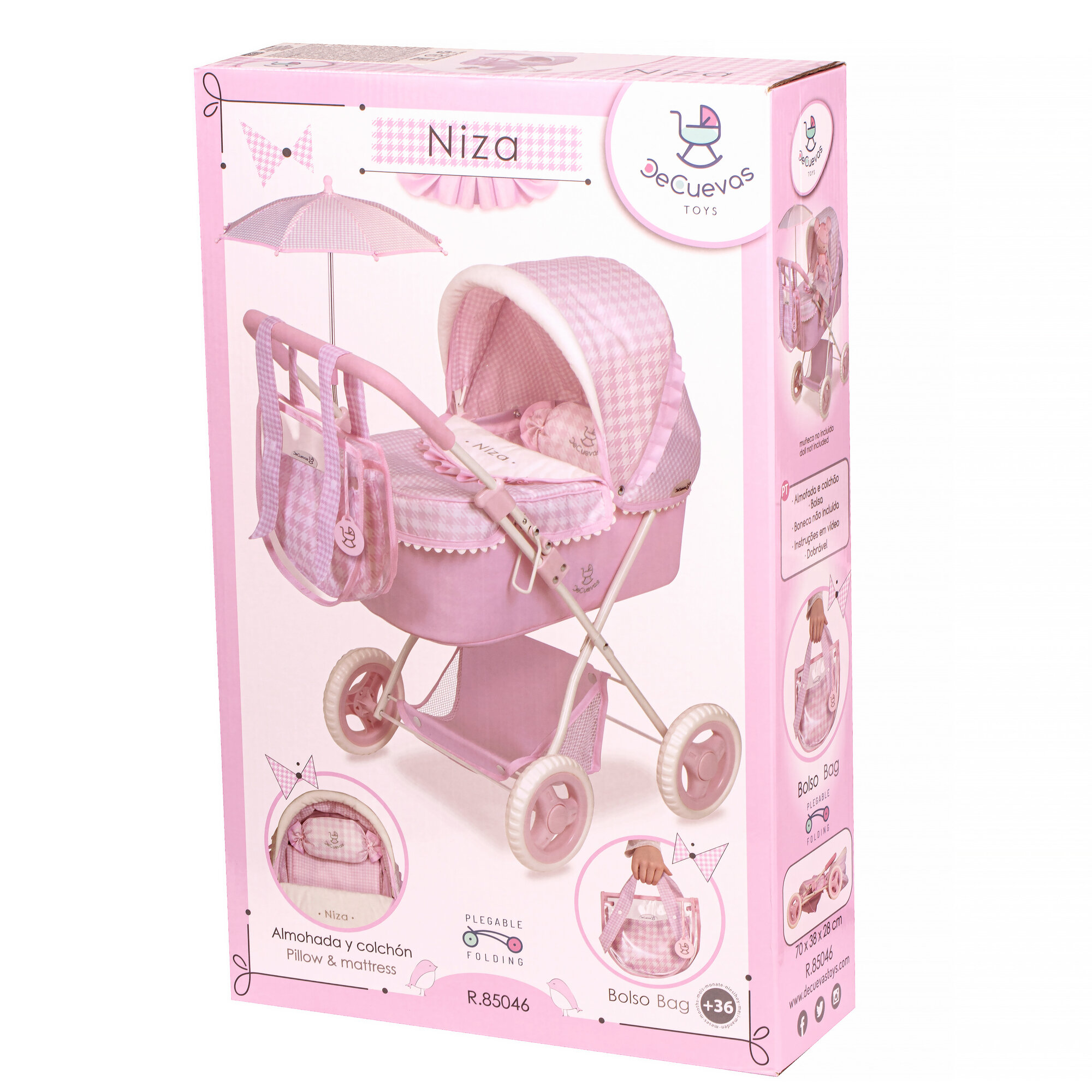 Купить Коляска для кукол люлька 85046 DeCuevas Toys, с аксессуарами съемной прозрачной сумкой и зонтом, высота ручки 60 см, серия Ницца, классический дизайн