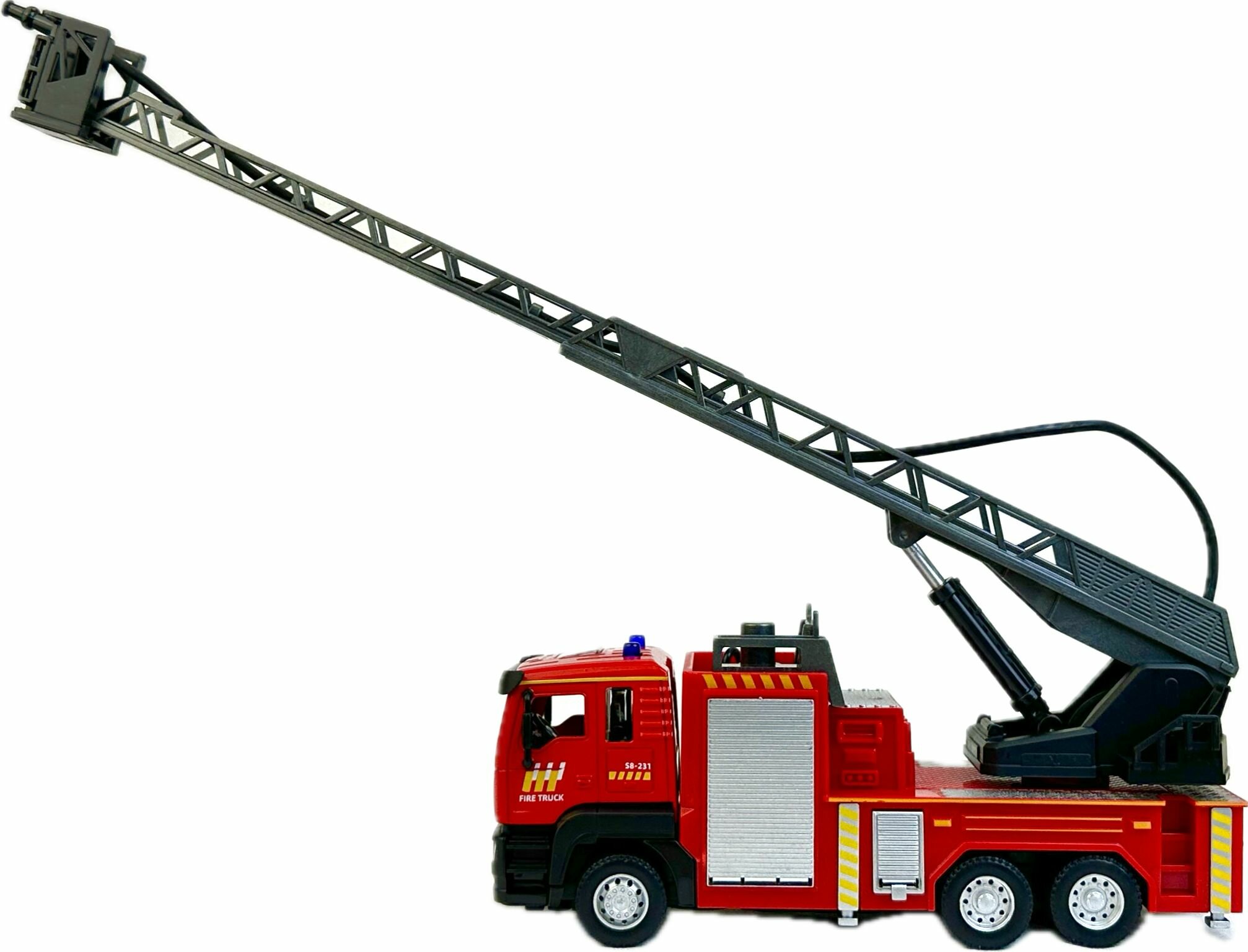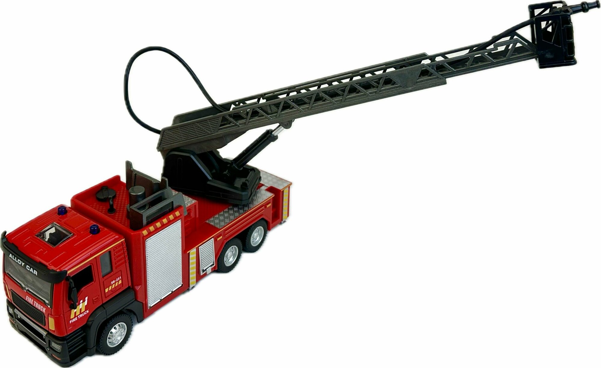 Купить Инерционная пожарная машина, 1:43, откидная металлическая кабина, выдвижная лестница, звук сирены, стреляет водой, фары светятся, 21х11х6 см