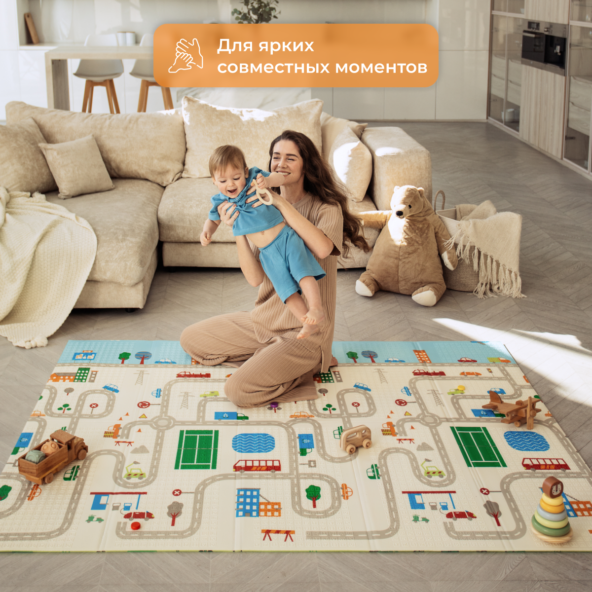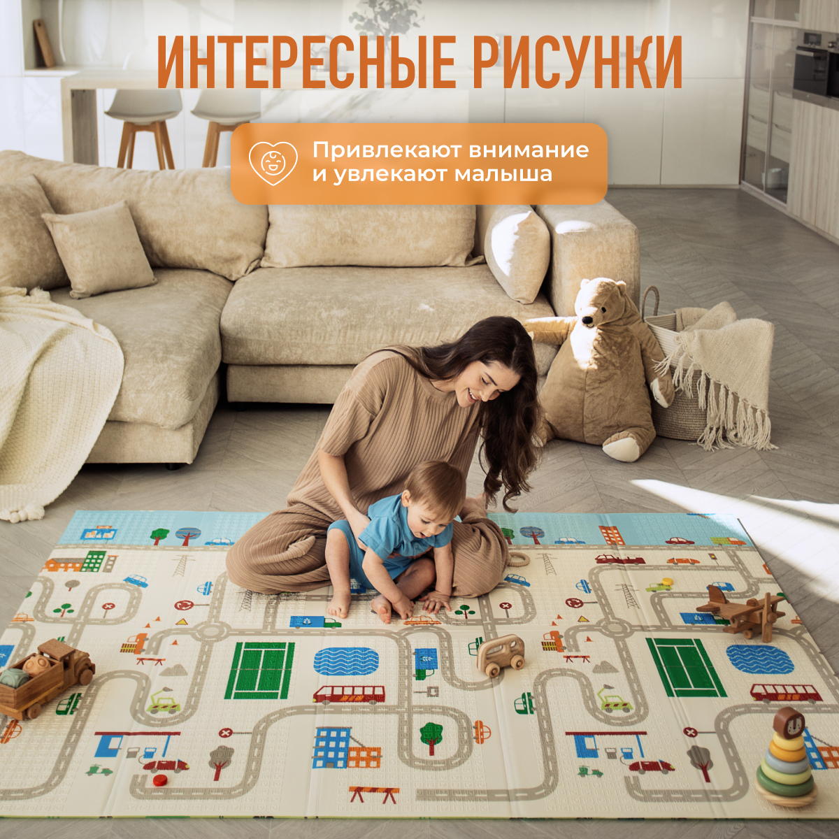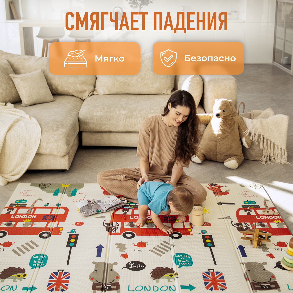 СохранитьДетский коврик для ползания складной двухсторонний игровой термоковрик Mamagoods 150х200 Автобус и Городок интересное: