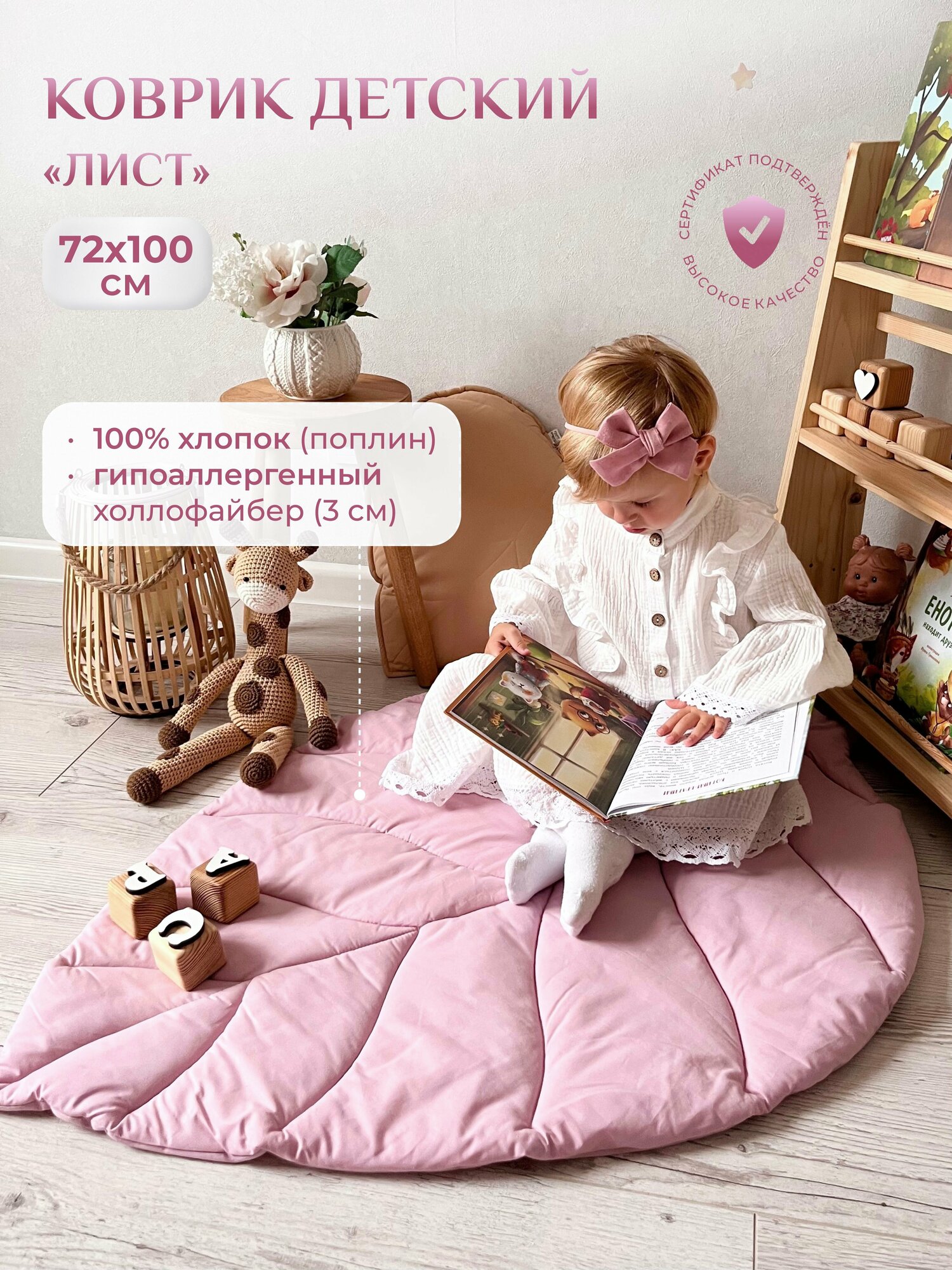 Коврик детский "Лист", Childrens-Textiles, 72*100 см, 100% хлопок, цвет: светло-розовый