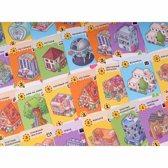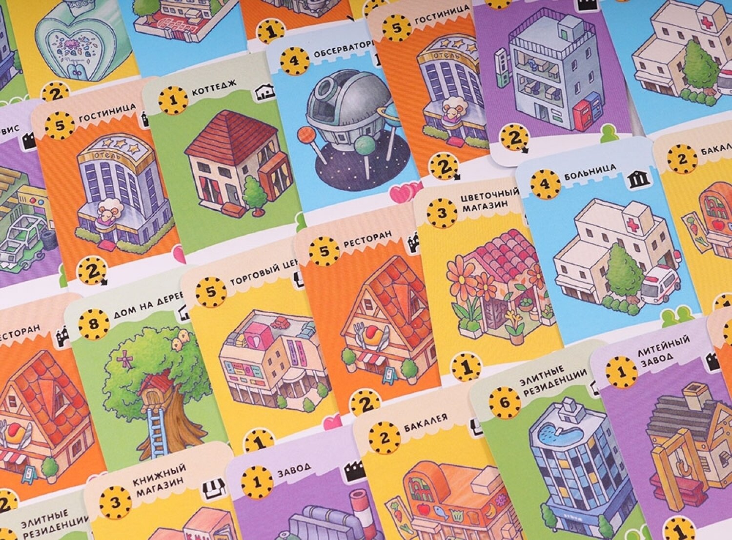 | Комплектация | В состав настольной игры входят: компоненты базовой игры - 30 монет (20 с номиналом 1 и 10 с номиналом 5); 140 карточек: 66 зданий (с рубашками трёх видов), 56 особых зданий (18 для семейного и 38 для экспертного режимов), 12 жилых зданий, 5 счастливых рынков,1 памятка дохода; компоненты дополнения - 20 разноцветных карточек строений, 5 карточек монстров, 5 фигурок монстров, 15 жетонов стоп-зилла (по 3 шт. 5 цветов); правила игры и правила дополнения. |