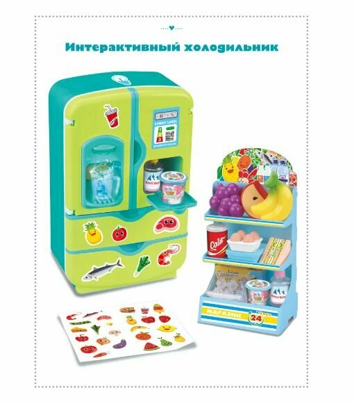 | Комплектация | Холодильник интерактивный 3 элемента / полка для продуктов 1 шт. / лист с декоративными наклейками 1 шт. / фрукты 3 шт. / баночки 3 шт. / лоток с яйцами 1 шт. / сэндвич 1 шт. / лоток для льда 1 шт. / «льдинки» 6 шт. / коробочка 1 шт. / стаканчик 1 шт |